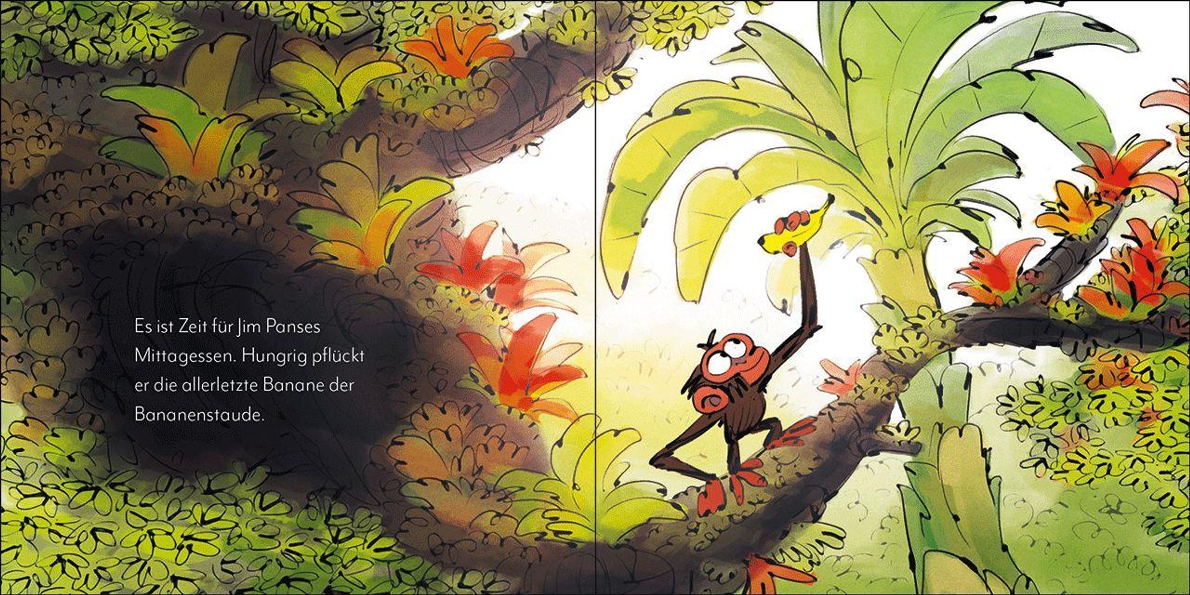 Hunger! Jim hat sich die letzte Banane geschnappt. Doch - oh nein - sie fällt ihm herunter und Warzenschwein hebt sie auf. Wem gehört die Banane nun?