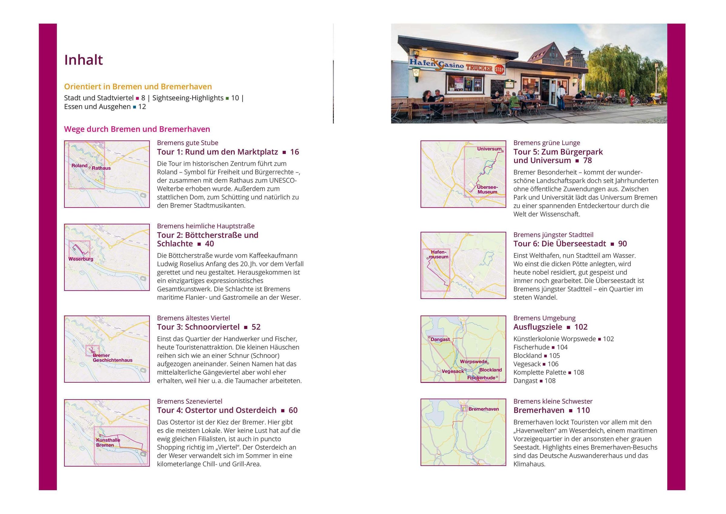 Sechs ausführlich beschriebene Touren führen Sie durch die ganze Stadt. Ausflüge in die Umgebung sowie ein Abstecher nach Bremerhaven, Bremens kleiner Schwester, runden den Reiseführer ab. Die Touren und Ausflüge führen in alle Winkel der Stadt, wobei auch Viertel abseits der Top-Sehenswürdigkeiten berücksichtigt werden. Subjektiv, persönlich und wertend -- die MM-Bücher mit ihren Restaurant- und Einkaufstipps, ihren Hintergrundgeschichten und Service-Infos sind, was sie schon immer waren: mehr als 'nur' Reiseführer.