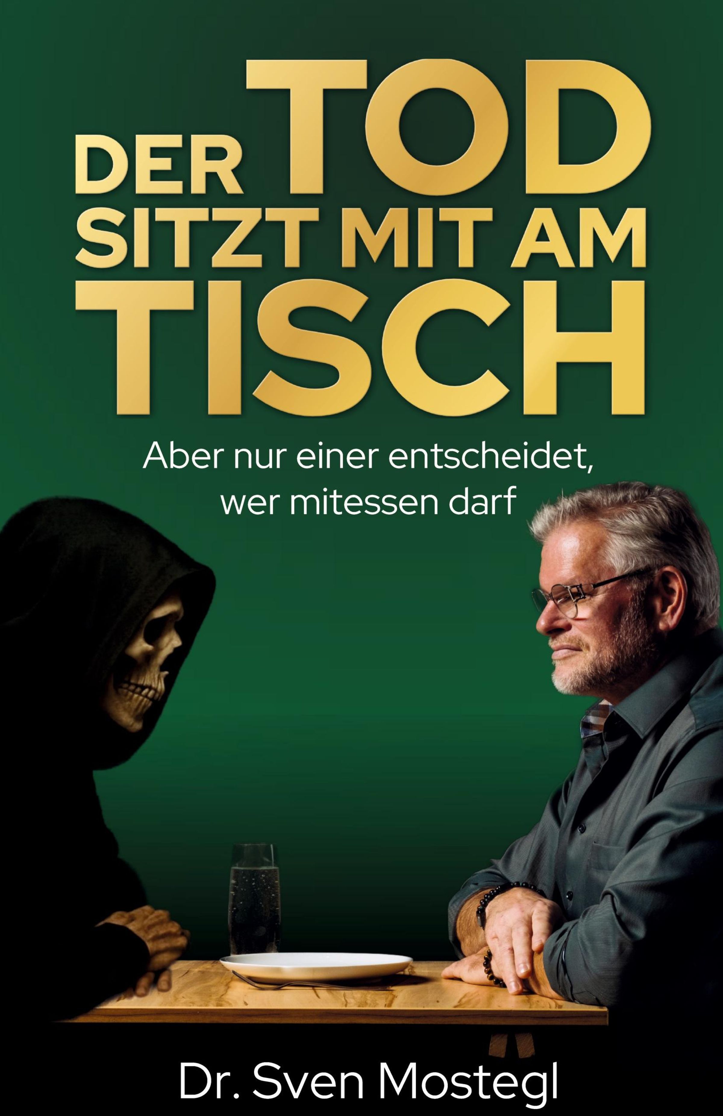 "Der Tod sitzt mit am Tisch. Aber nur einer entscheidet, wer mitessen darf. Dr. Sven Mostegl." Ein Sensenmann und ein Mann am Tisch., Buch