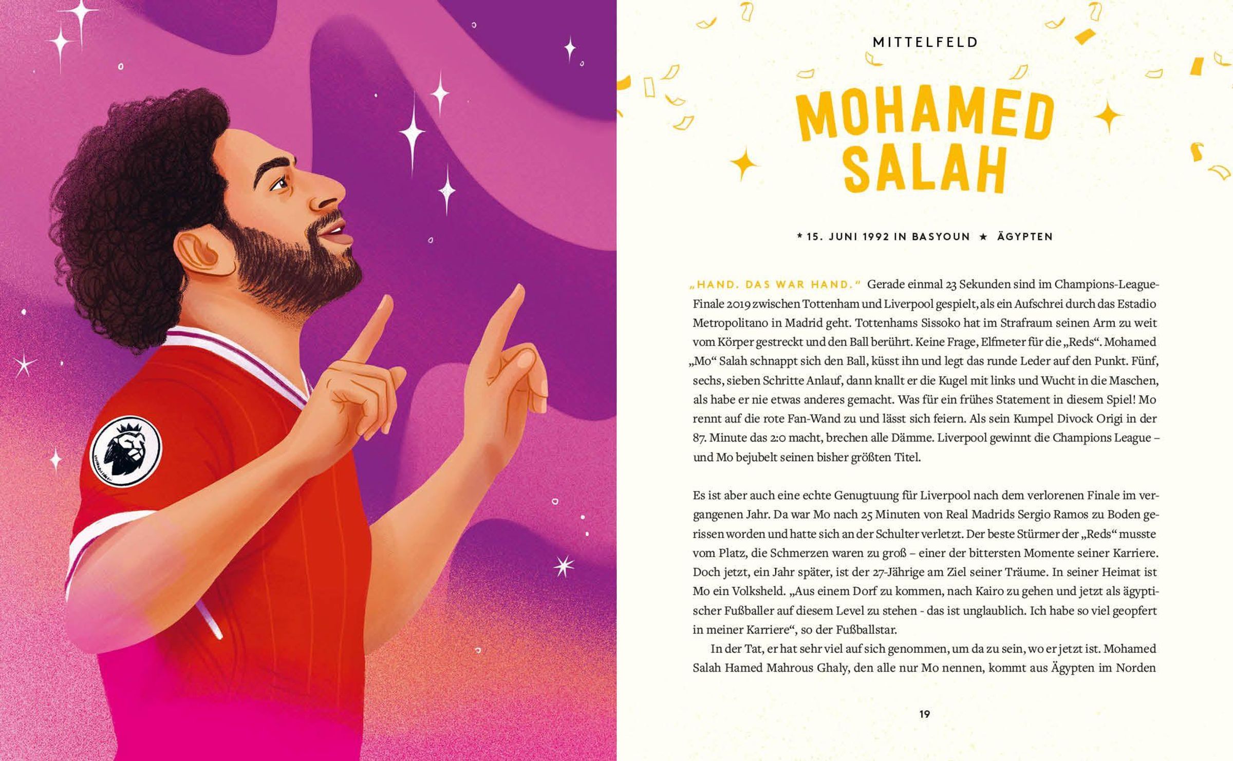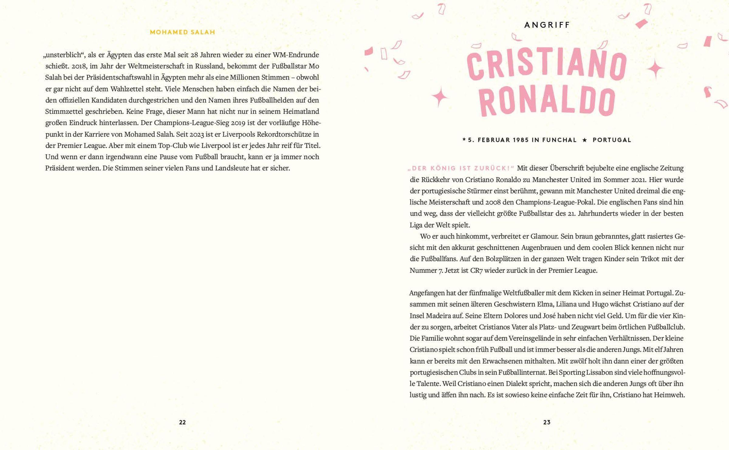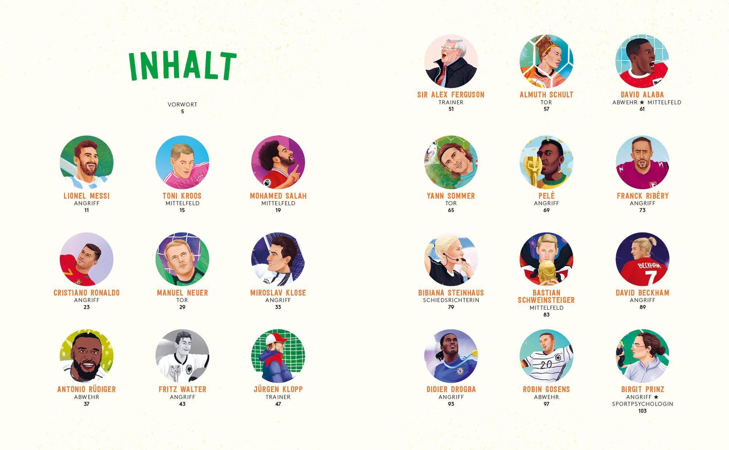 Sven Voss bringt Groß und Klein bereichernde Lebensgeschichten von Fußballer*innen mit besonderen Biografien nahe. Von Weltfußballer Lionel Messi und Superstar Cristiano Ronaldo über Ausnahmeerscheinung Marta undSchiedsrichterin Bibiana Steinhaus bis hin zur Fußballlegende Pelé und Trainer Jürgen Klopp sind alle dabei! In dieser Neuausgabe reihen sich auch fünf neue Persönlichkeiten ein**,** daruntereiner der beiden erfolgreichsten deutschen Fußballer , Tonis Kroos, und Trainer-Genie Xabi Alonso . Die Sportgeschichten dieser inspirierenden Persönlichkeiten sind nicht nur tolle Vorlesegeschichten, die Biografien ermutigendie kleinen Leser auch dazu, den Lieblingshelden nachzueifern. Sie führen ihnen außerdem vor Augen, dass Beharrlichkeit, Mut und Selbstbewusstsein oft ans Ziel führen.