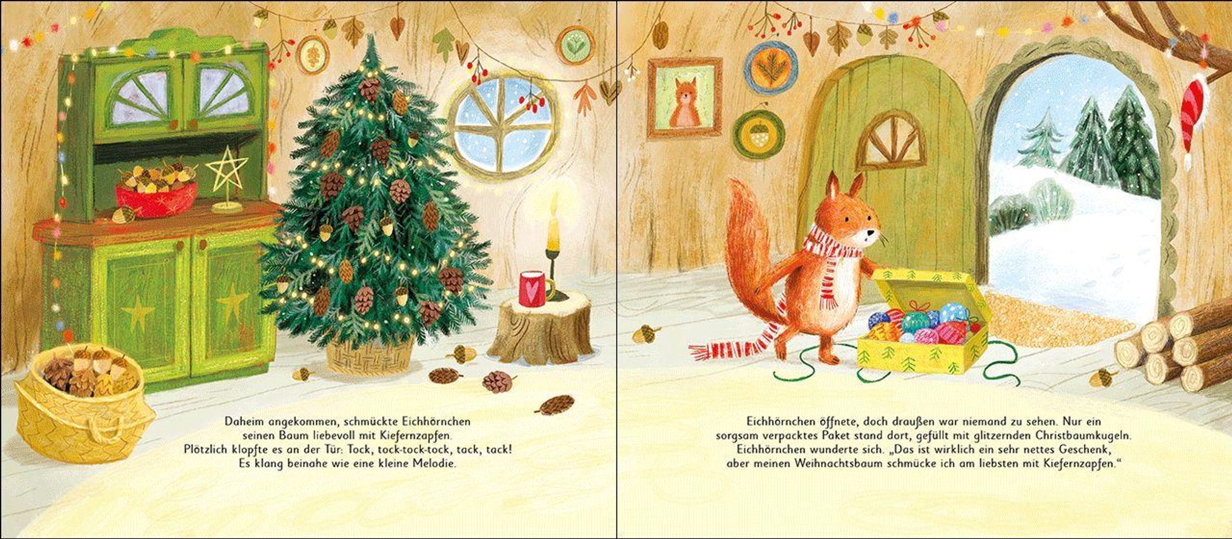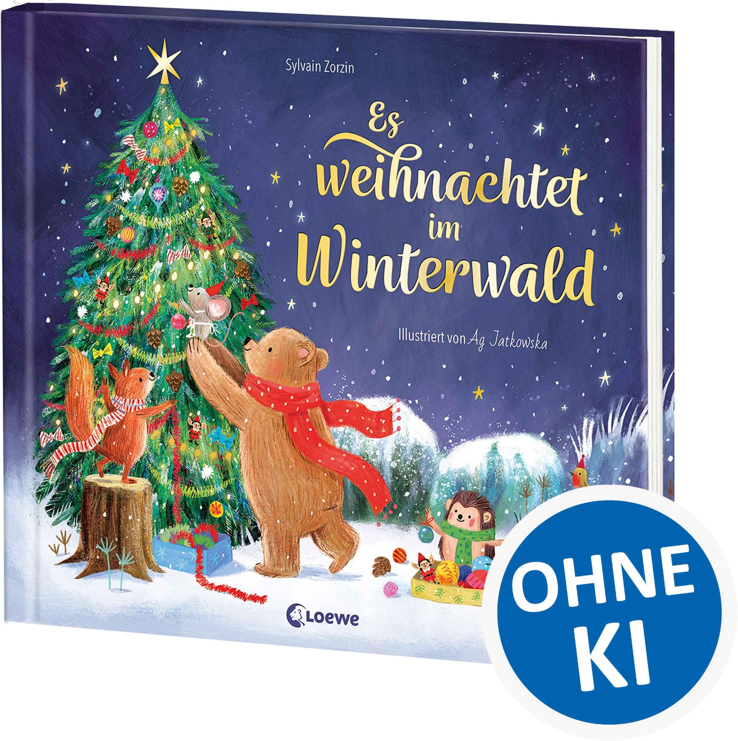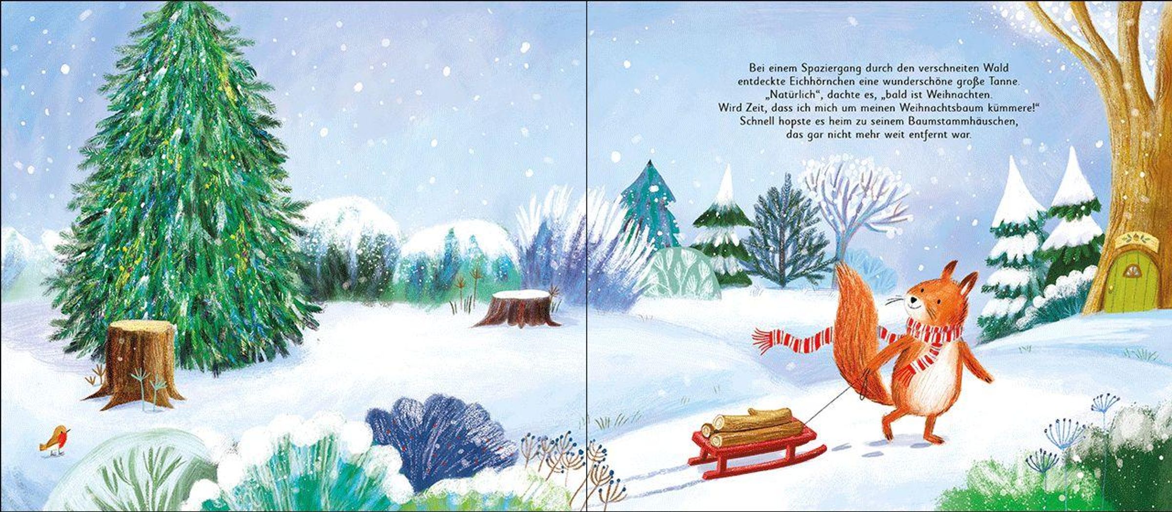 „Es weihnachtet im Winterwald“. Ein Bär und ein Eichhörnchen schmücken einen Weihnachtsbaum im Schnee., Buch