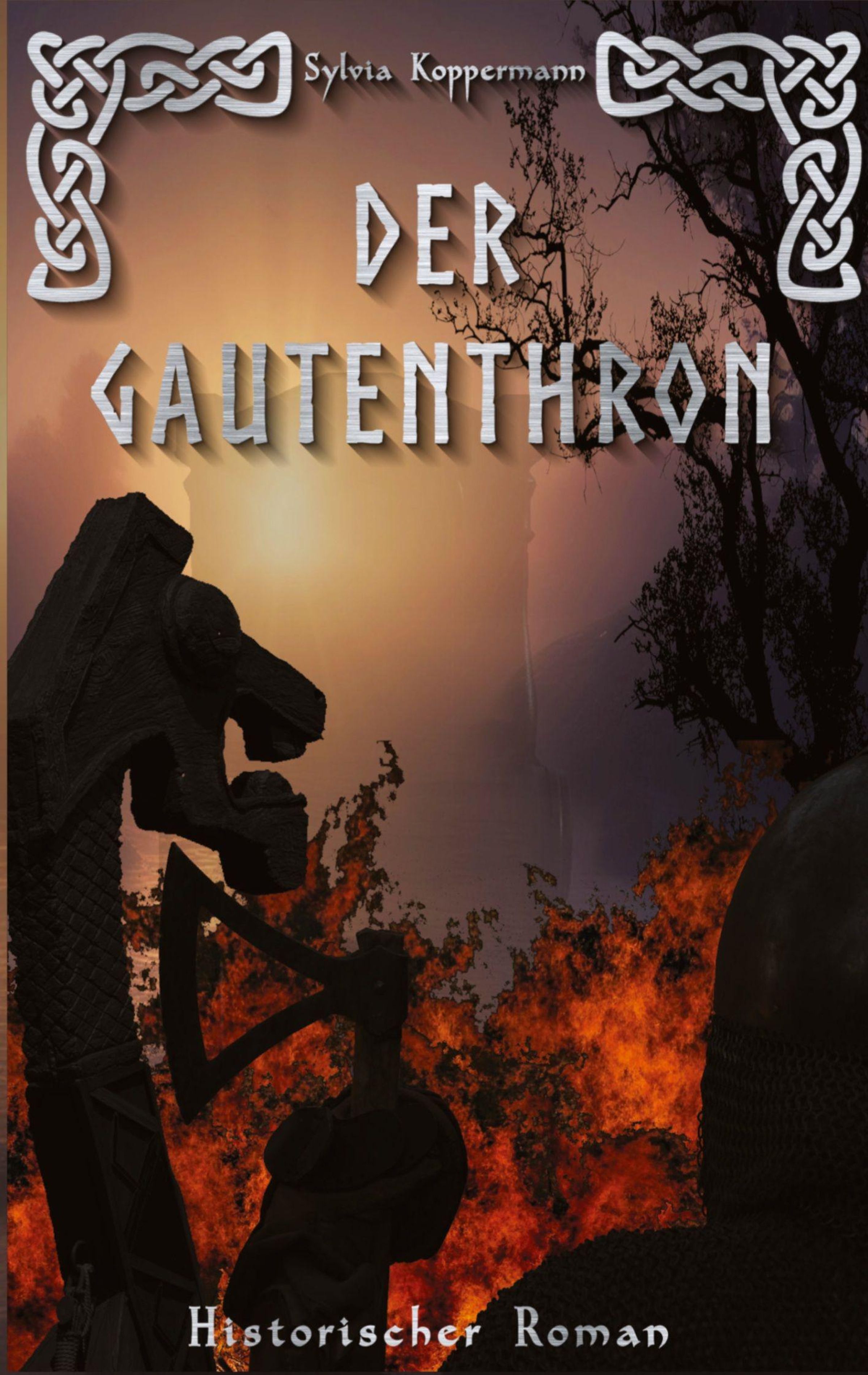 "Der Gautenthron: Historischer Roman" auf keltischem Hintergrund, mit Flammen und einem Wikingerhelm im Vordergrund., Buch
