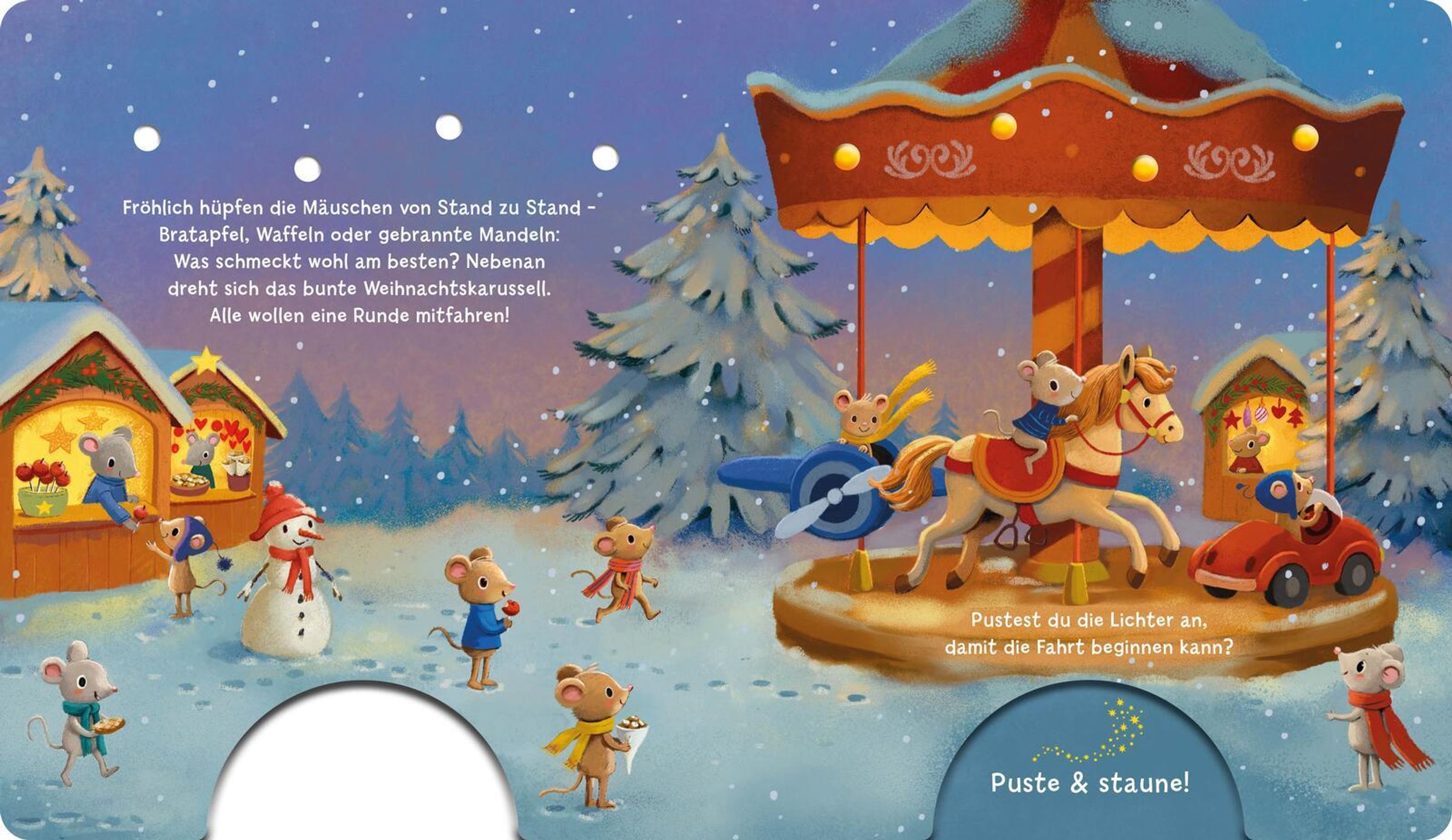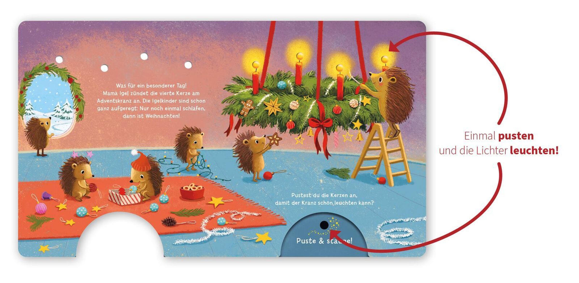 Die kleinen Leser ab 18 Monaten können auf jeder Seite mitmachen und die leuchtenden LED-Lichter durch Pusten zum Funkeln bringen. Ein zauberhaftes Puste-Buch zum Kennenlernen der Weihnachtsrituale.