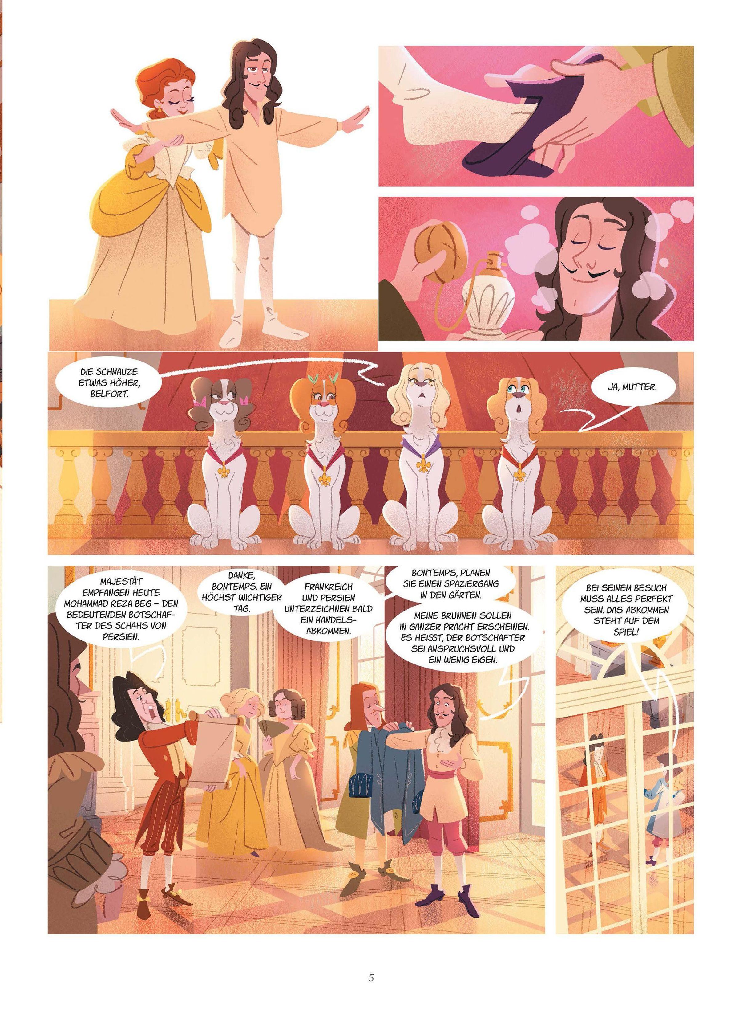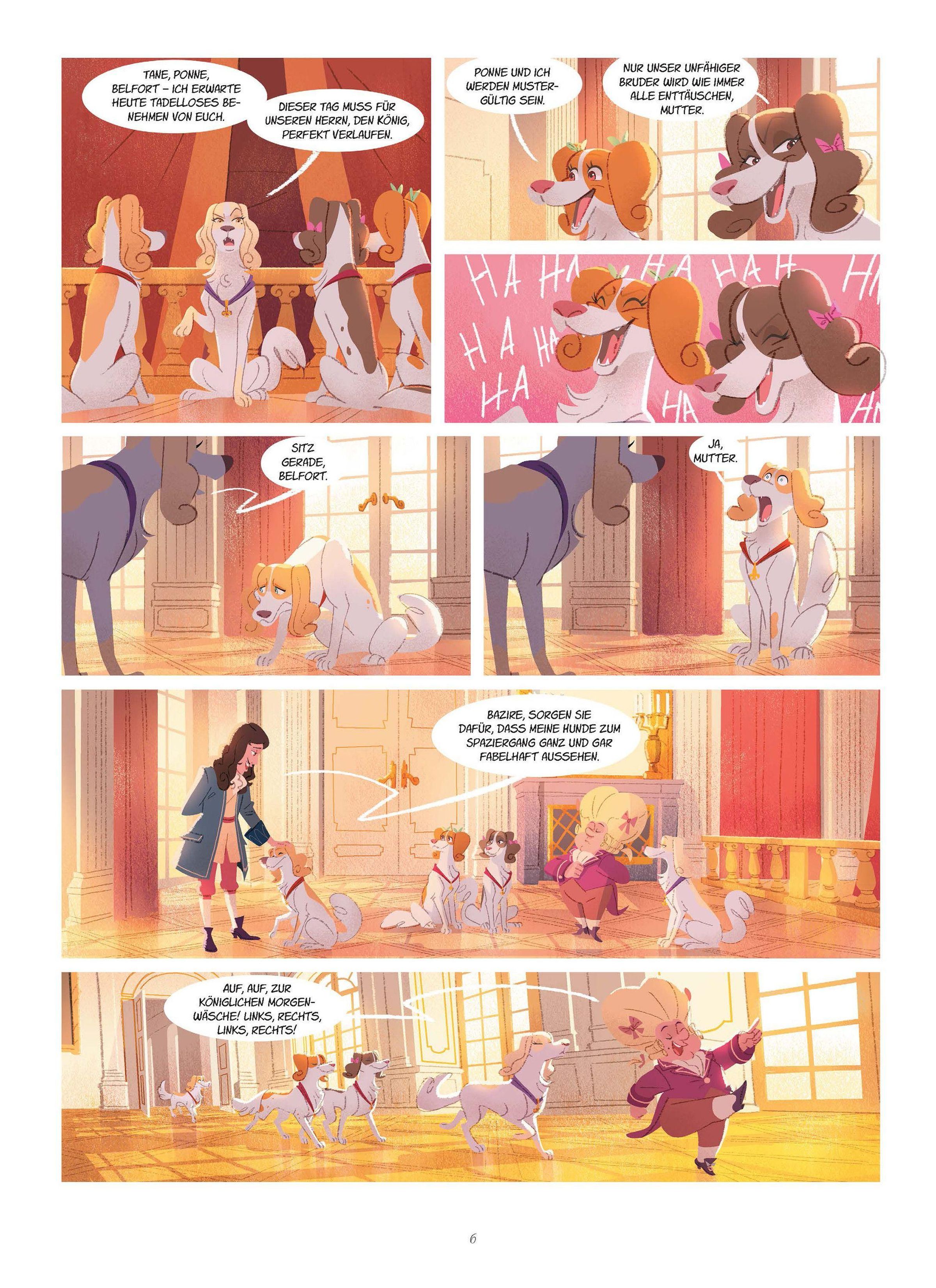 Die beliebte Zeichentrickserie auf dem Kinderkanal jetzt auch als Comic-Album! Was für ein turbulenter Tag im Palast von Versailles! Der König erwartet den Besuch eines wichtigen Gesandten und möchte ihn mit den spektakulären Springbrunnen in den Schlossgärten beeindrucken. Für die Bewohner der umliegenden Teiche sind das jedoch schlimme Neuigkeiten: Das ganze Wasser wird für die Fontänen benötigt, und sie sitzen auf dem Trockenen! Belfort und sein Freund Lupin sorgen sich um die Karpfen Antras und Diem. Ihre Eier stehen kurz vor dem Schlüpfen, aber ohne Wasser werden sie vertrocknen. Die Hunde bitten die Maus Gazette um Hilfe. Sie verrät ihnen die Geheimnisse der Wasser von Versailles, aber die Zeit drängt... Seit einiger Zeit macht das dynamische Hundeduo Belfort und Lupin nicht nur Versailles unsicher, sondern tobt auch durch den KiKa - als bezaubernde Animationsserie! Dieses Comicabenteuer der tierischen Freunde ist nicht nur unterhaltsam, sondern umfasst auch einen informativen Anhang über die Wasserspektakel von Versailles.
