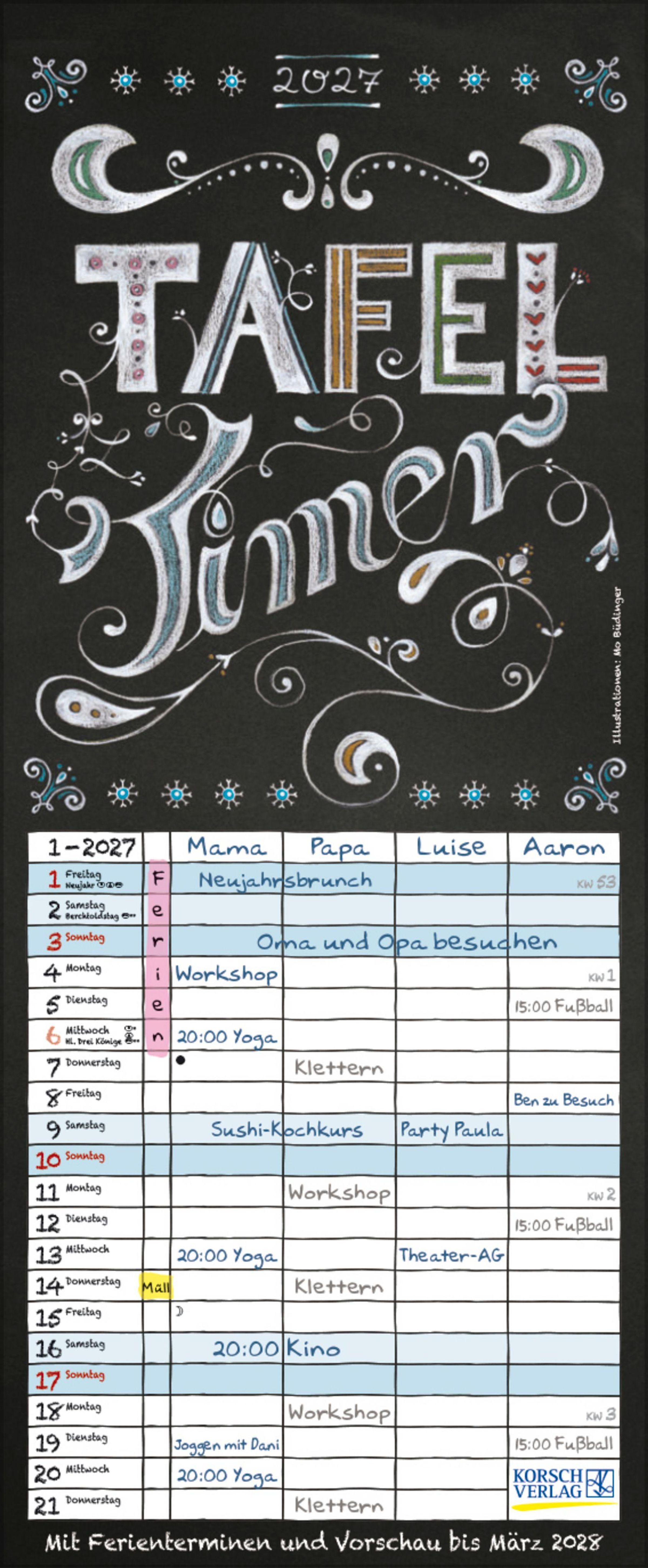 - Typo Art Familienkalender mit 4 breiten Spalten in Tafeloptik. Hochwertiger Familienplaner mit Ferienterminen, Vorschau bis März 2027.