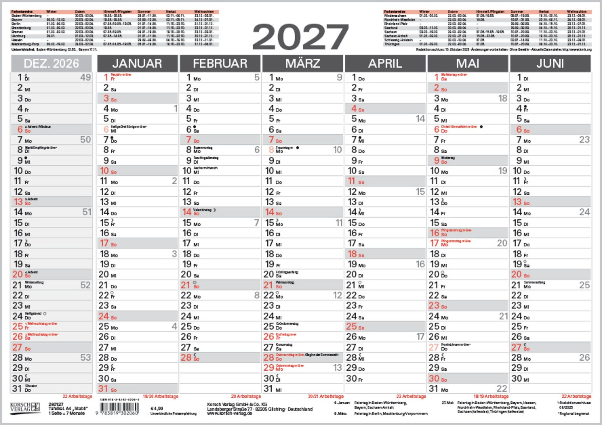 Praktische Jahresplanung im handlichen A4-Format auf einem starken, stabilen Karton. Auf jeder Seite 7 Monate mit Ferienterminen und viel Platz zum Eintragen. Kalendarium in deutscher Sprache.
