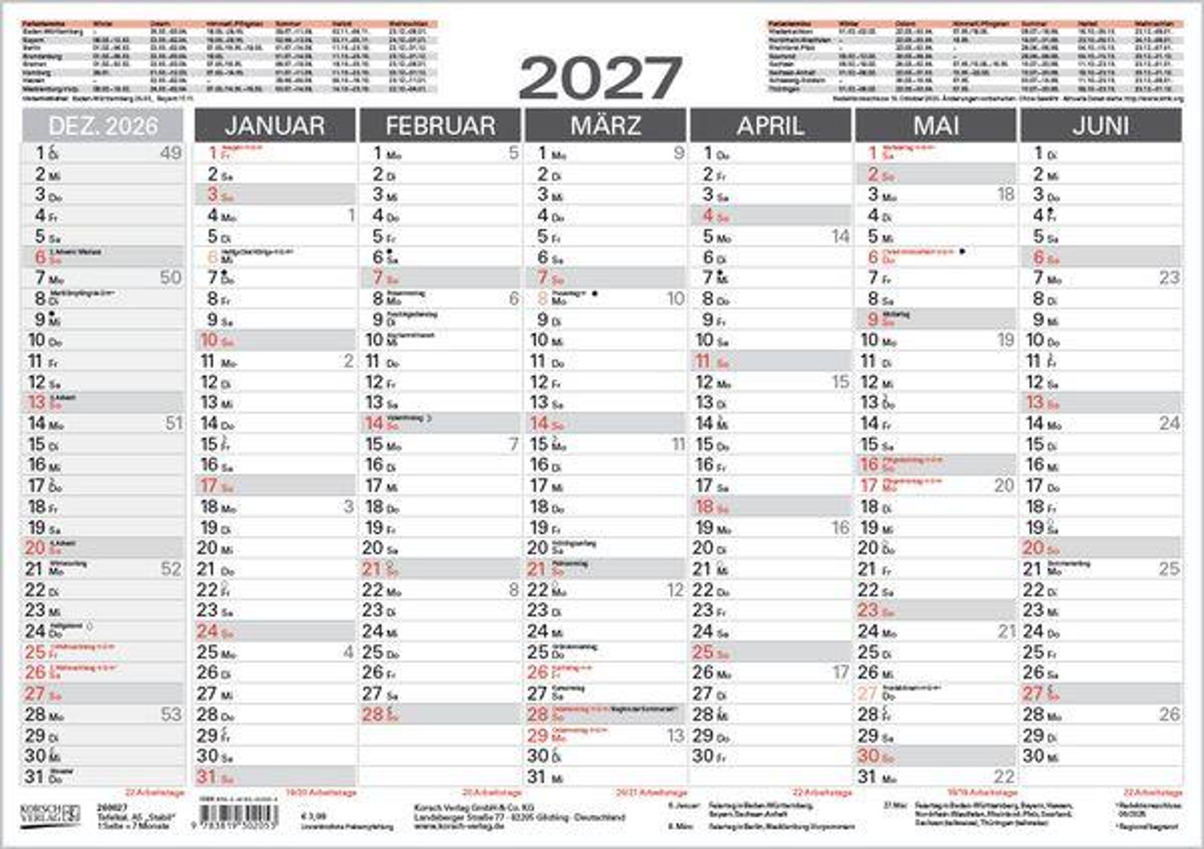 Kalendarium auf Deutsch mit hervorgehobenen Sonn- und Feiertagen für D, A und CH