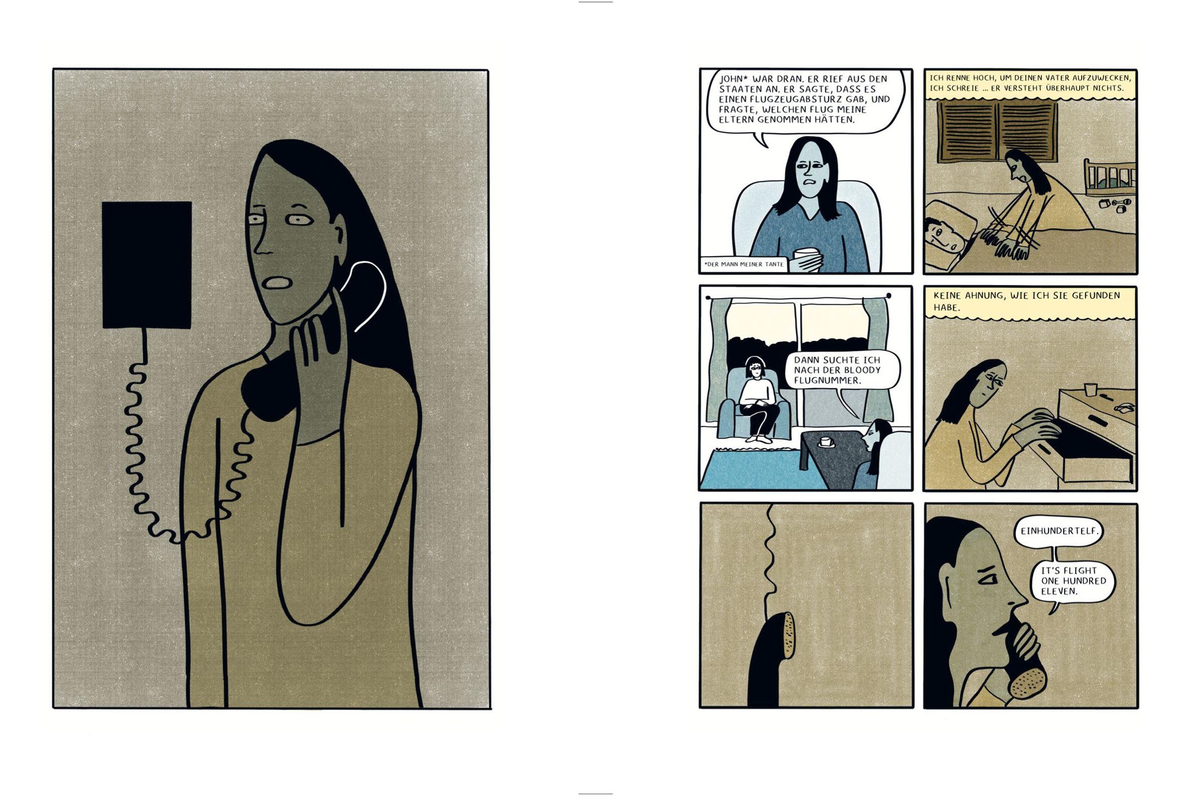 „FLUG 111 - Unsere Worte nach dem Unglück“ von Talel Aronowicz; Illustration mit Personen, Zeitung, Natur und Uhr., Buch
