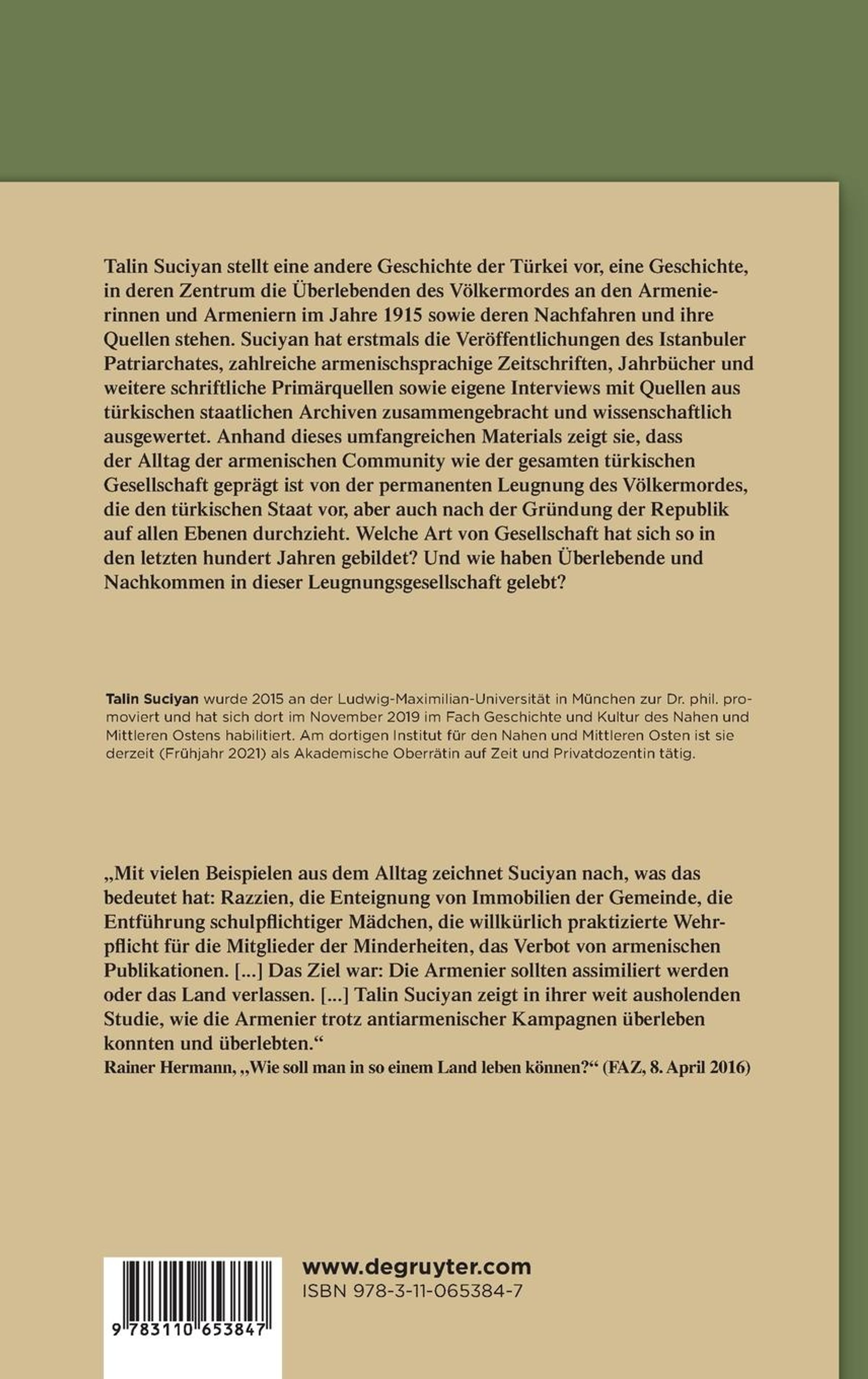 Talin Suciyan stellt eine andere Geschichte der Türkei vor, eine Geschichte, in deren Zentrum die Überlebenden des Völkermordes an den Armenierinnen und Armeniern im Jahre 1915 sowie deren Nachfahren und ihre Quellen stehen. Suciyan hat erstmals die Veröffentlichungen des Istanbuler Patriarchates, zahlreiche armenischsprachige Zeitschriften, Jahrbücher und weitere schriftliche Primärquellen sowie eigene Interviews mit Quellen aus türkischen staatlichen Archiven zusammengebracht und wissenschaftlich ausgewertet. Anhand dieses umfangreichen Materials zeigt sie, dass der Alltag der armenischen Community wie der gesamten türkischen Gesellschaft geprägt ist von der permanenten Leugnung des Völkermordes, die den türkischen Staat vor, aber auch nach der Gründung der Republik auf allen Ebenen durchzieht. Welche Art von Gesellschaft hat sich so in den letzten hundert Jahren gebildet? Und wie haben Überlebende und Nachkommen in dieser Leugnungsgesellschaft gelebt? Talin Suciyan wurde 2015 an der Ludwig-Maximilian-Universität in München zur Dr. phil. promoviert und hat sich dort im November 2019 habilitiert. Am dortigen Institut für den Nahen und Mittleren Osten ist sie derzeit (Frühjahr 2021) als Akademische Oberrätin auf Zeit und Privatdozentin tätig. "Mit vielen Beispielen aus dem Alltag zeichnet Suciyan nach, was das bedeutet hat: Razzien, die Enteignung von Immobilien der Gemeinde, die Entführung schulpflichtiger Mädchen, die willkürlich praktizierte Wehrpflicht für die Mitglieder der Minderheiten, das Verbot von Armenischen Publikationen. [...] Das Ziel war: Die Armenier sollten assimiliert werden oder das Land verlassen. [...] Talin Suciyan zeigt in ihrer weit ausholenden Studie, wie die Armenier trotz antiarmenischer Kampagnen überleben konnten und überlebten." Rainer Hermann, "Wie soll man in so einem Land leben können?" (FAZ, 8. April 2016)