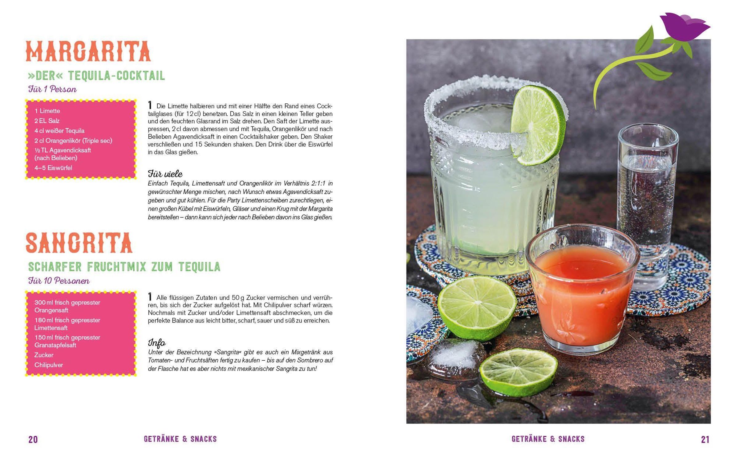 - Rund 100 der besten Rezepte zum Feiern mit Freunden oder zum Selbst-Genießen - mit Streetfood-Lieblingen wie Tacos, Burritos, Fajitas oder Enchiladas, feinen Partysnacks wie Tomatensalsa oder Guacamole und gekühlten Drinks wie Margaritas oder Sangria. Dazu gibt es rundum satt machende Hauptgerichte wie Huhn in Schokoladensauce, Chili con Carne oder mexikanisches Pulled Pork und süße Desserts wie Karamellcreme-Eis, Tres-Leches-Kuchen oder kandierten Kürbis.
