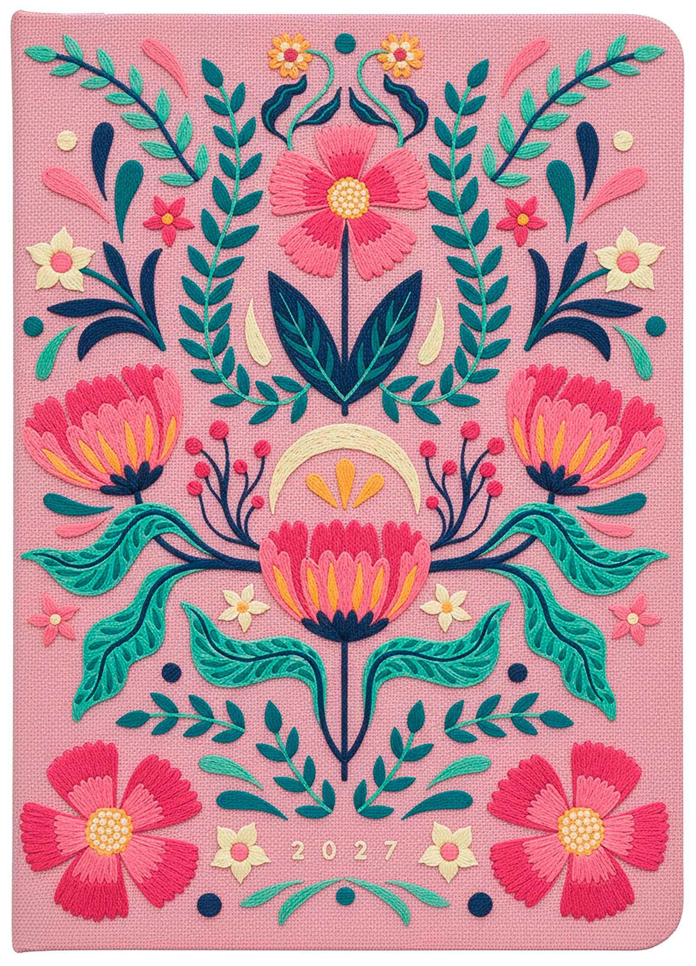 Taschenkalender A5 2027: Blütenmotiv, bestickt, rosa, Gebunden