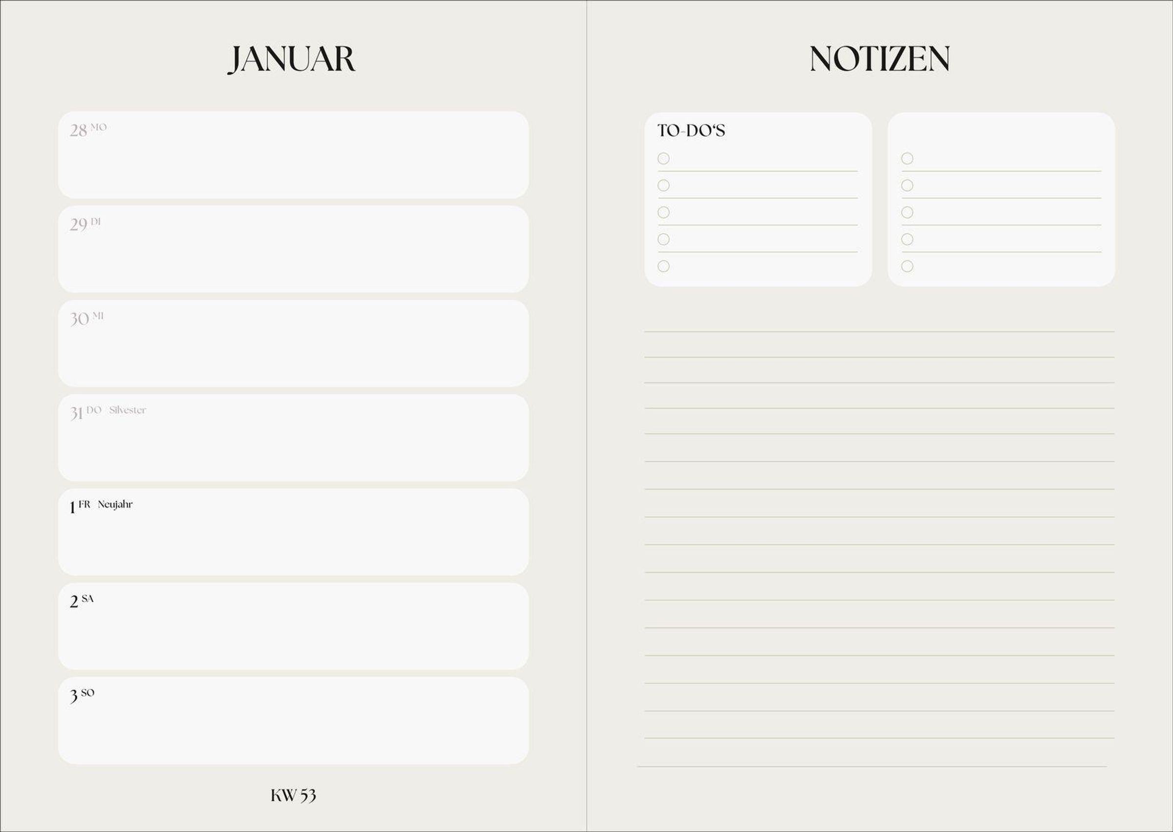 - Das praktische Wochenkalendarium auf einer Doppelseite bietet maximale Übersicht für alle Termine, To-do-Listen und Notizen.