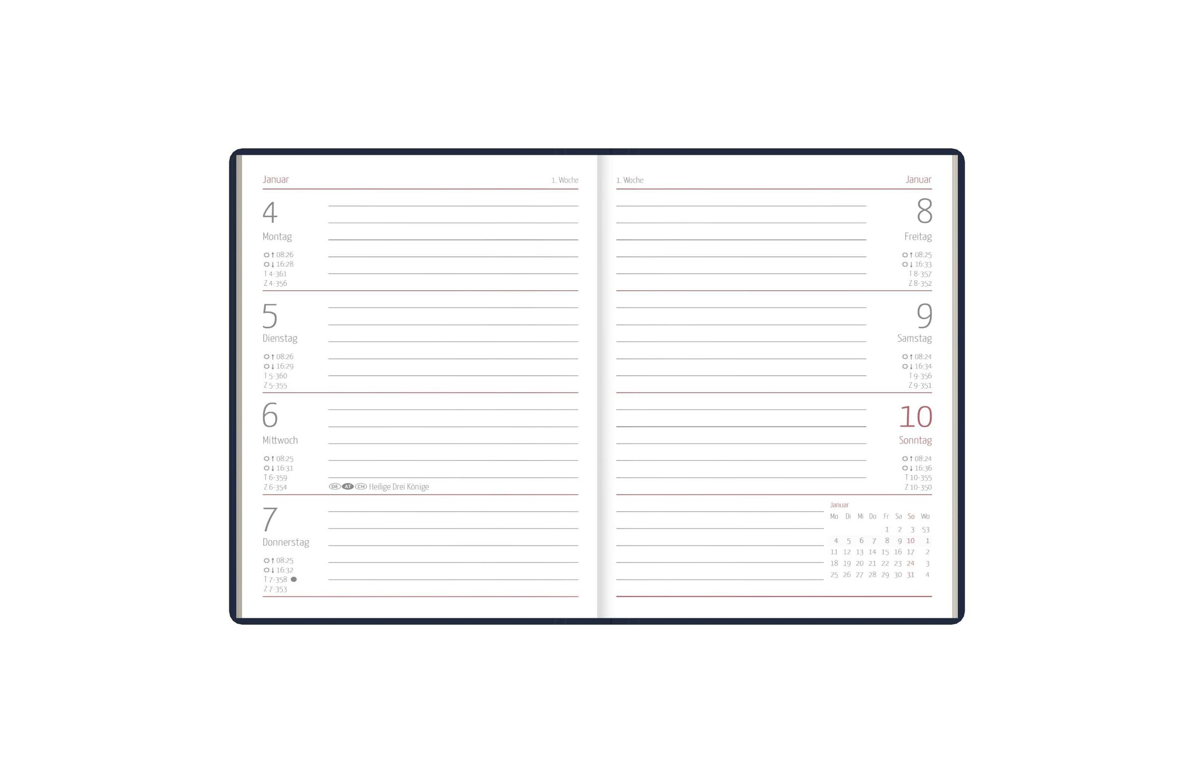 Übersichtliches Kalendarium: 1 Woche auf 2 Seiten, mit hervorgehobenen Sonn- und Feiertagen, Arbeitstage-, Tages- und Wochenzählung