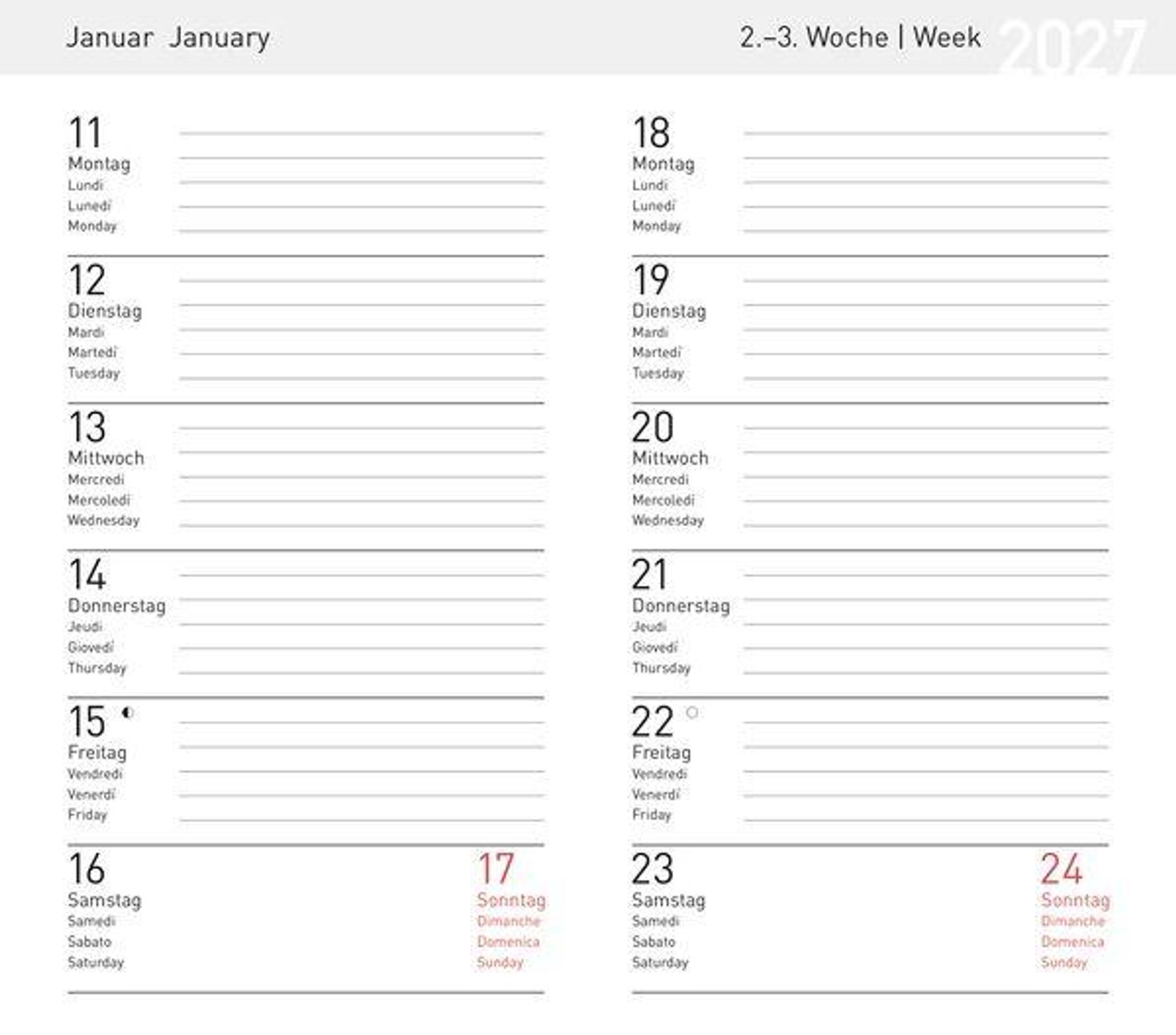 - Jede Kalenderwoche übersichtlich auf einer Seite ; Anzeige der Mondphasen
