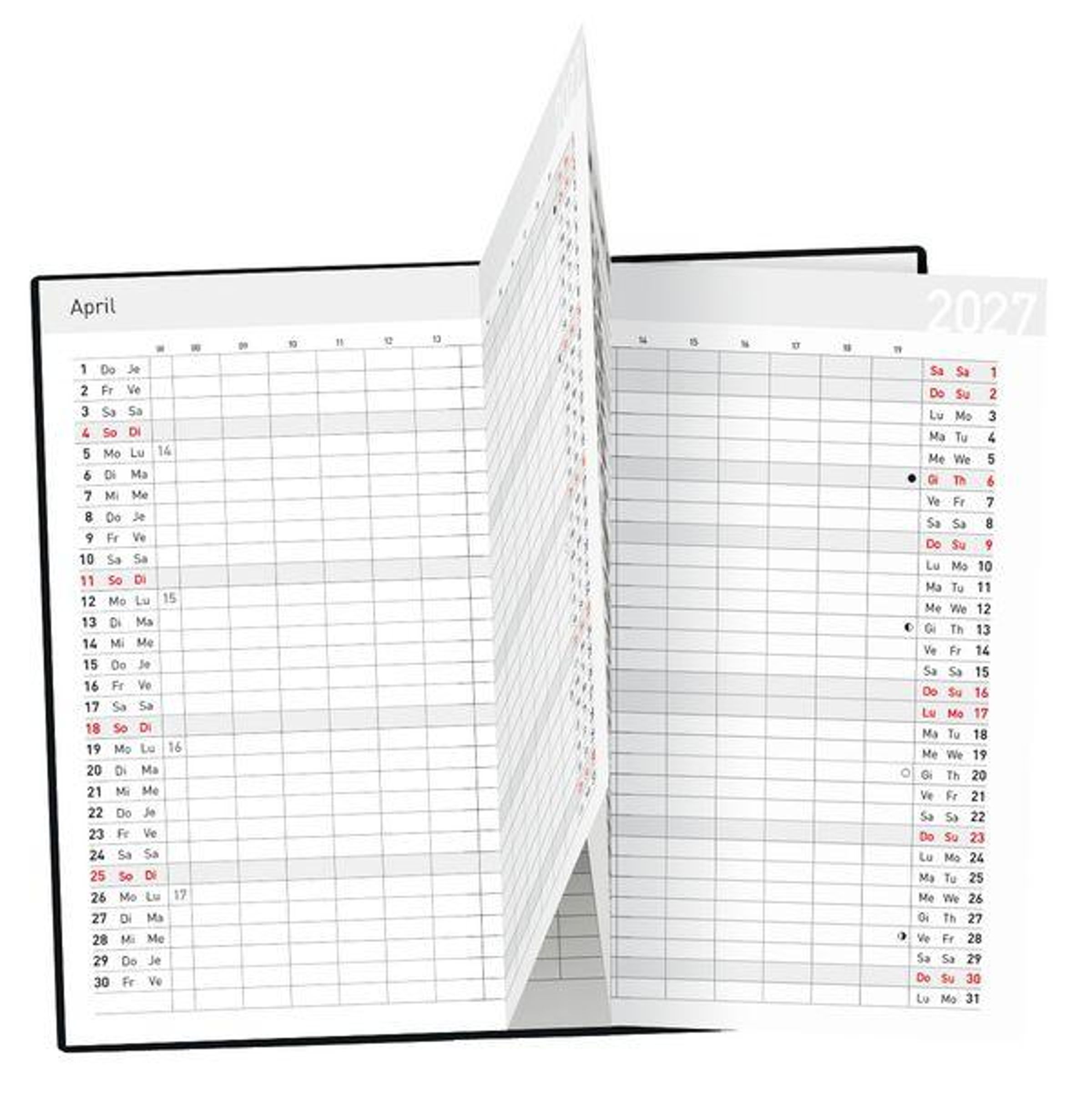 - Jeder Monat übersichtlich auf einer gefalzten, ausklappbaren Doppelseite ; Inklusive Uhrzeiten und Mondphasen