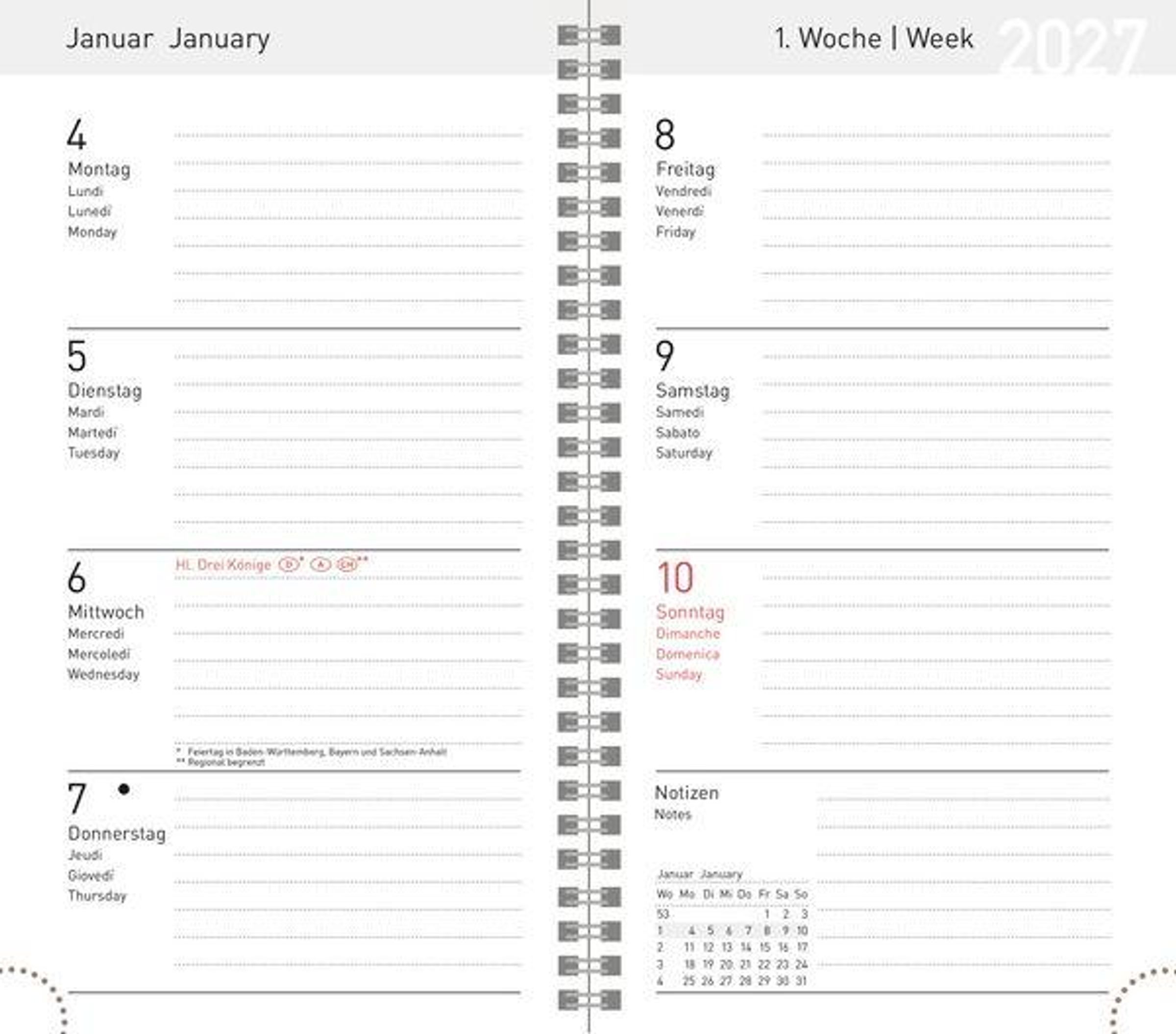 Produktmerkmale Taschenkalender im Format: 8, 7 x 15, 3 cm, 128 Seiten Jede Kalenderwoche übersichtlich auf einer Doppelseite Mehrsprachiges Kalendarium (D, E) mit Feiertagen und Ferienzeiten für Deutschland, Österreich und Schweiz Perfektes Lay-Flat Verhalten Anzeige der Mondphasen Moderner Taschenkalender mit malve-farbenem Einband. Umschlag aus edlem Strukturpapier. Pro Woche 1 Doppelseite. Kalendarium d-e-f-i.