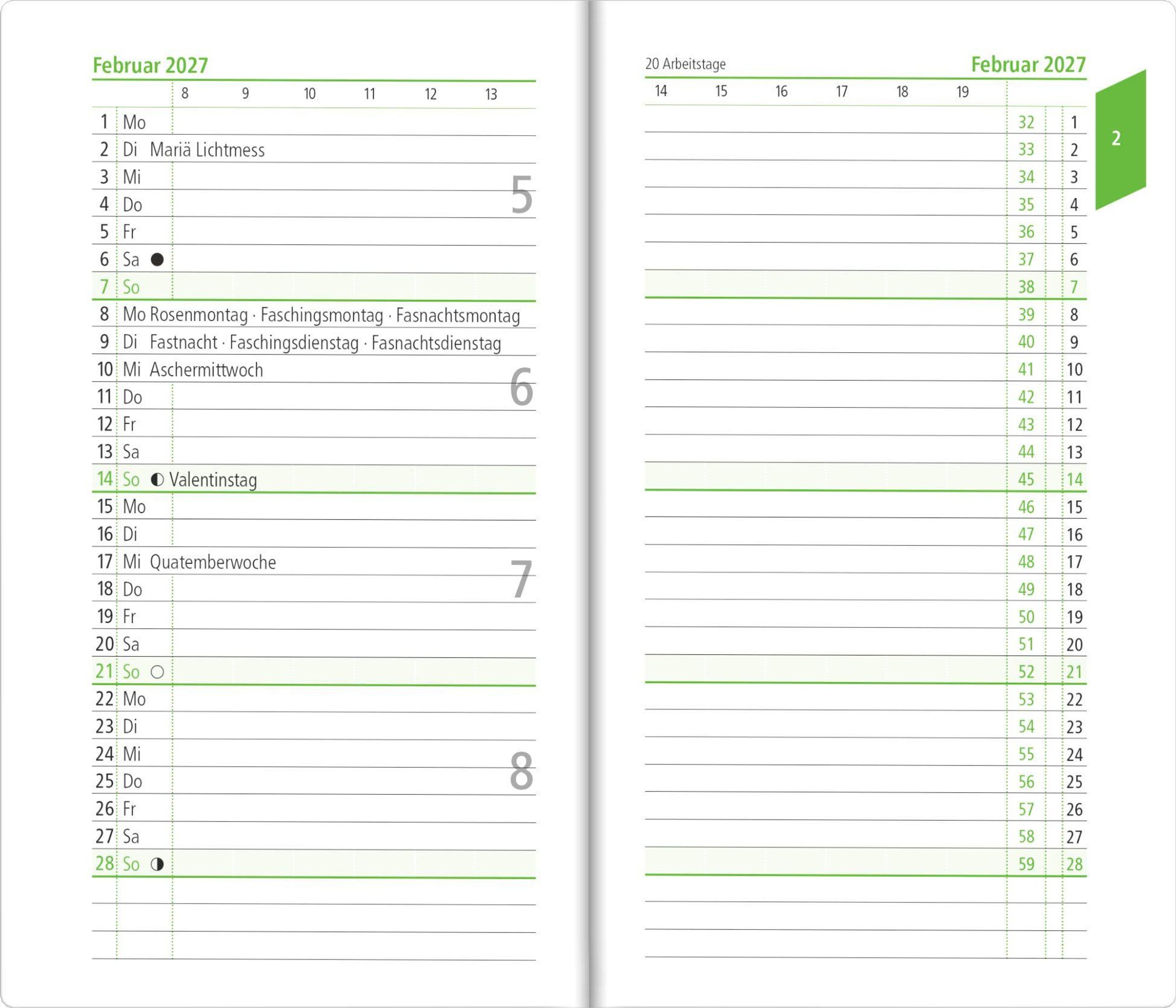 Übersichtliches Kalendarium: 1 Monat auf 2 Seiten, Sonn- und Feiertage hervorgehoben