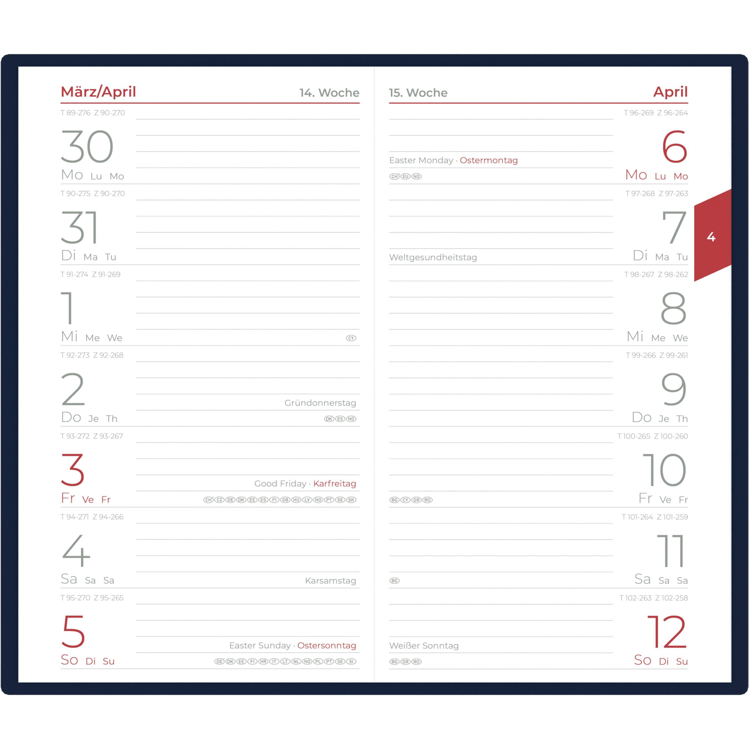 Übersichtliches Kalendarium: 1 Woche auf 1 Seite, Sonn- und Feiertage hervorgehoben