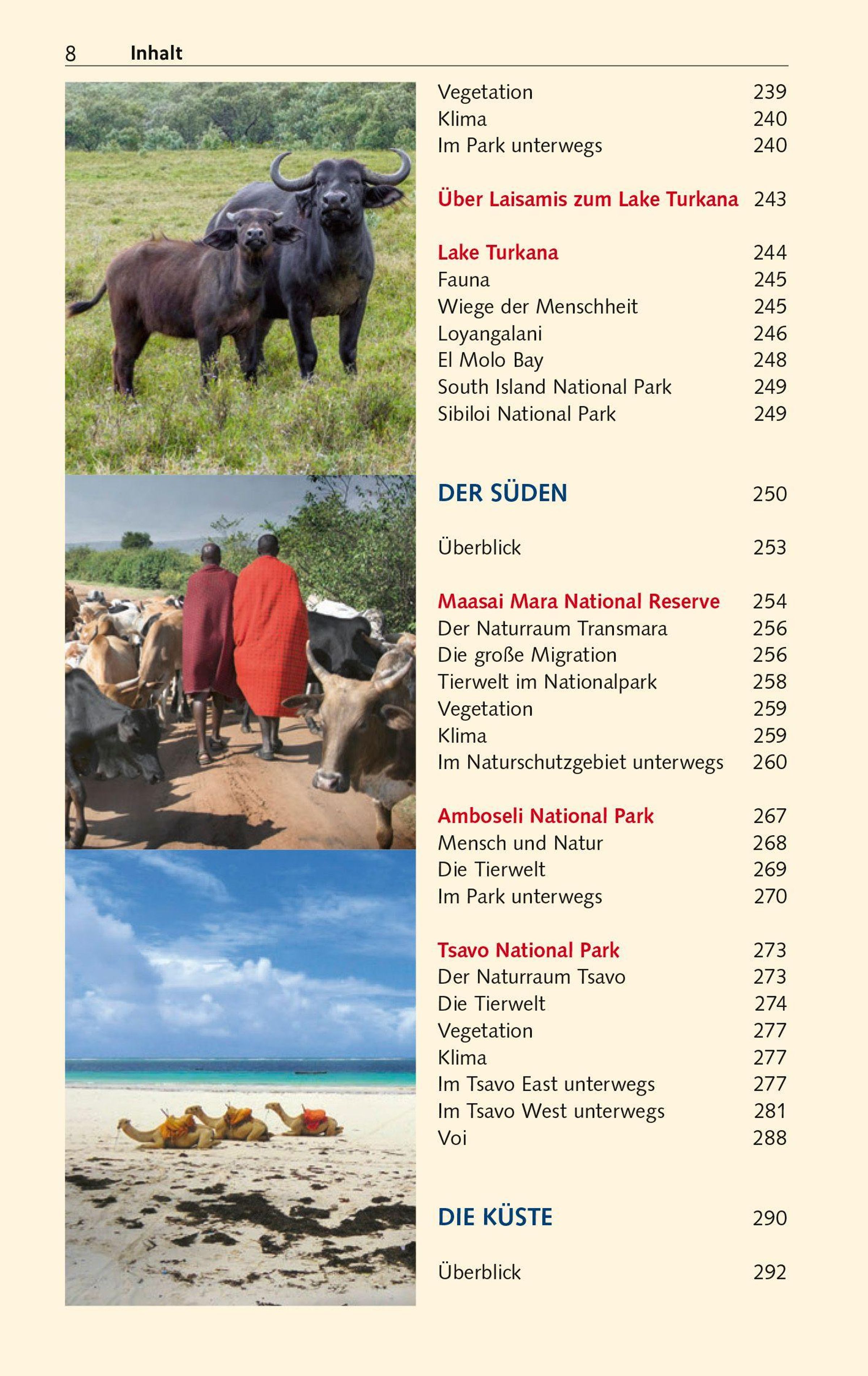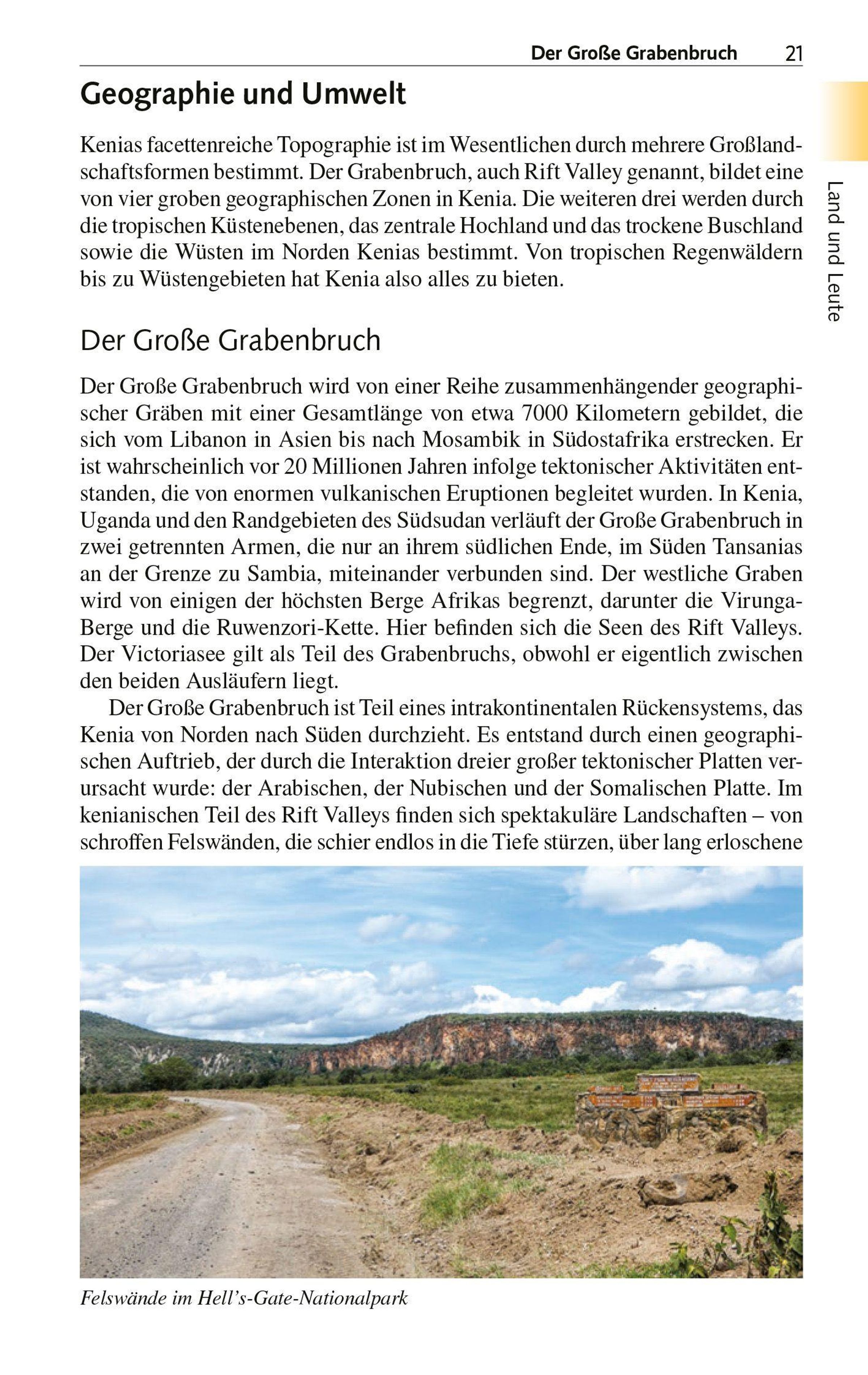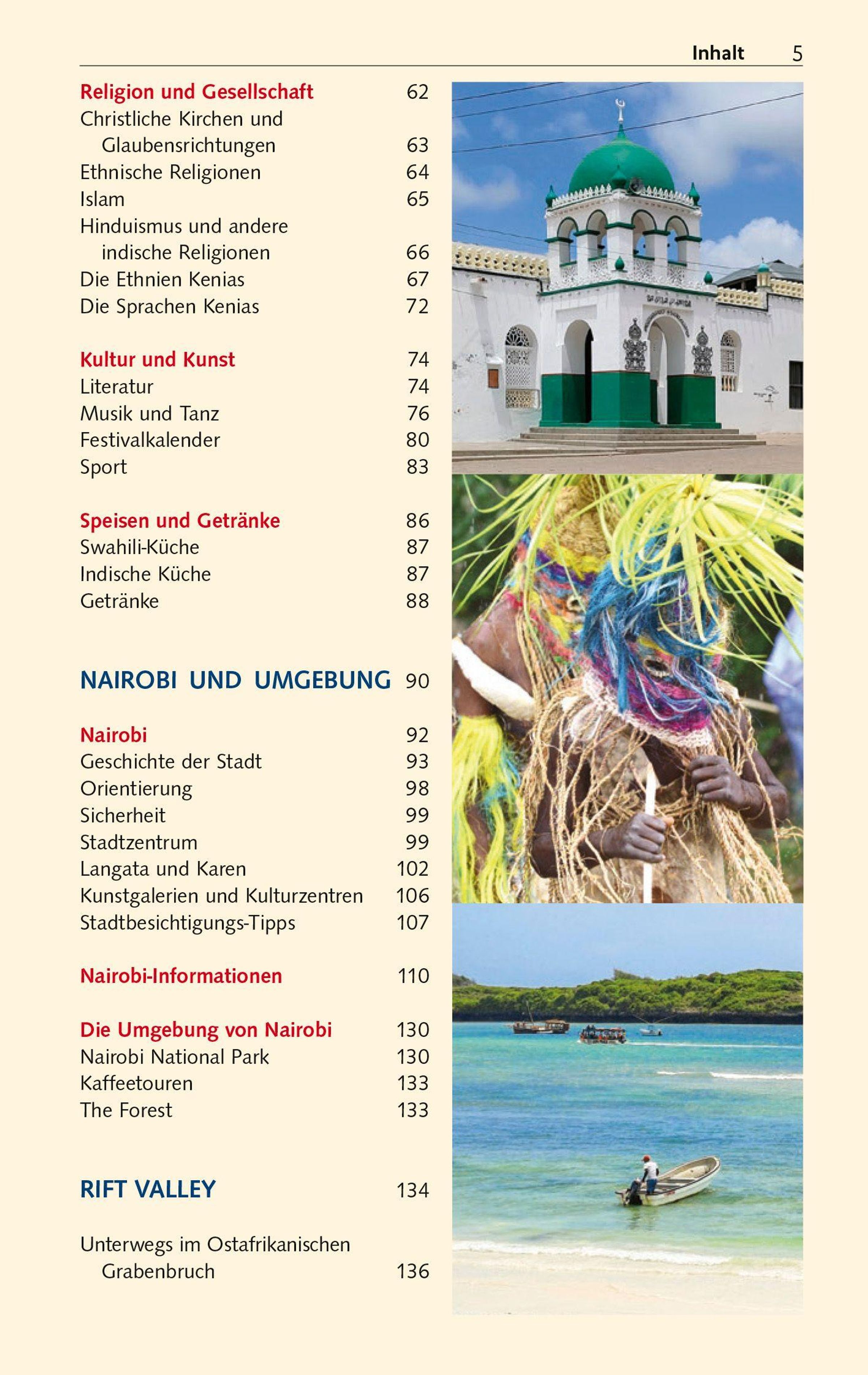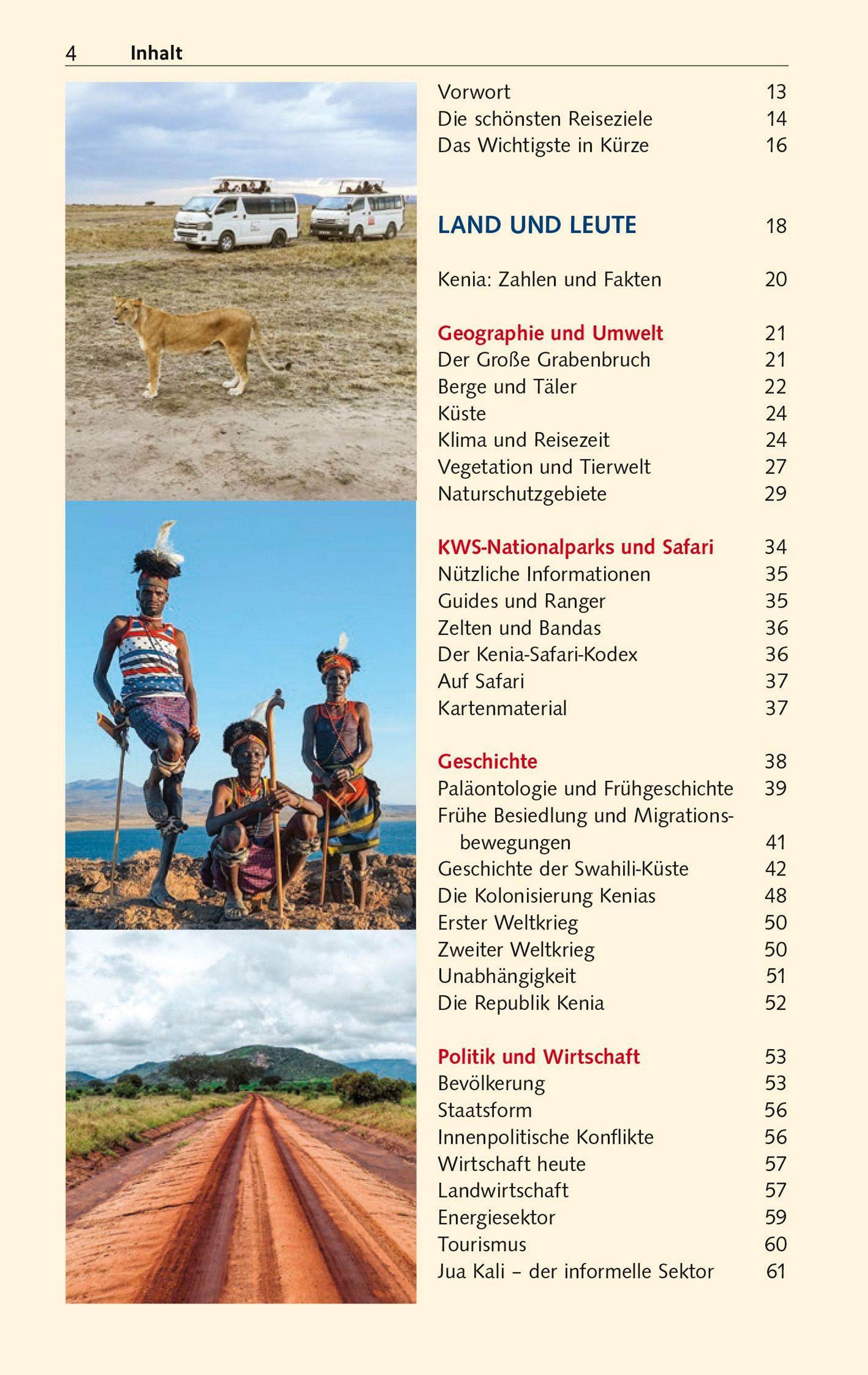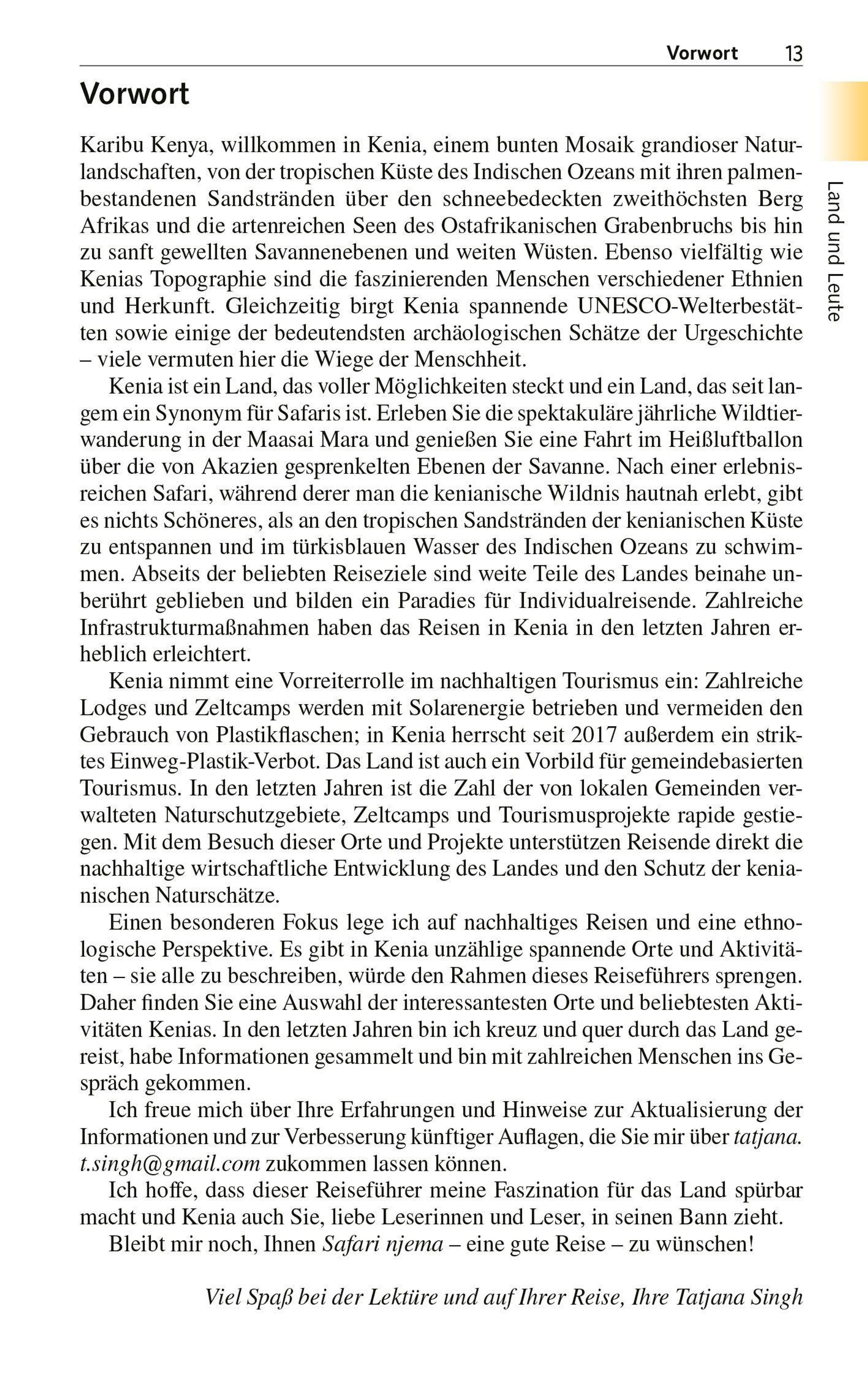 Autorin Tatjana T. Singh lebt in Kenia und kennt das Land bestens. Sie führt zu den Soda-Seen im Great Rift Valley und in den Norden zum Turkanasee, dem weltgrößten Wüstengewässer. Es geht zu den Korallenbänken und tropischen Traumstränden am Indischen Ozean sowie westlich zum Victoriasee. Alle wichtigen Orte und Sehenswürdigkeiten werden kundig beschrieben, allen voran die Hauptstadt Nairobi und an der Küste Mombasa, das pulsierende Zentrum der Swahili-Kultur. Dazu gibt es viel Wissenswertes zu den Naturräumen, Fauna und Flora sowie Gesellschaft, Kunst und Kulturen. Denn ebenso vielfältig wie Kenias Landschaften sind seine Ethnien, Sprachen und Traditionen.