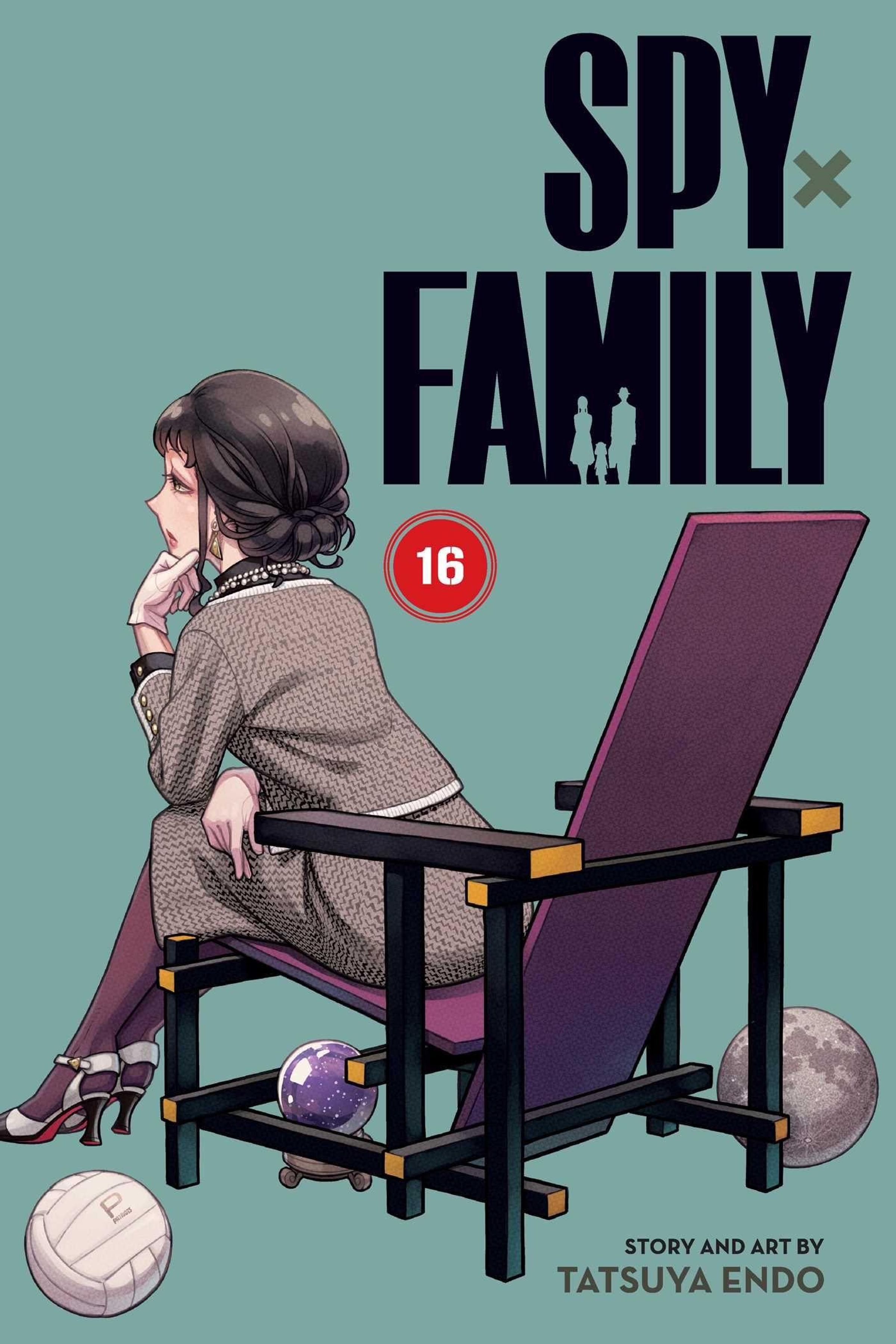 „SPY × FAMILY“, „16“, „STORY AND ART BY TATSUYA ENDO.“ Frau sitzt nachdenklich in einem Stuhl, mit Bällen am Boden., Buch