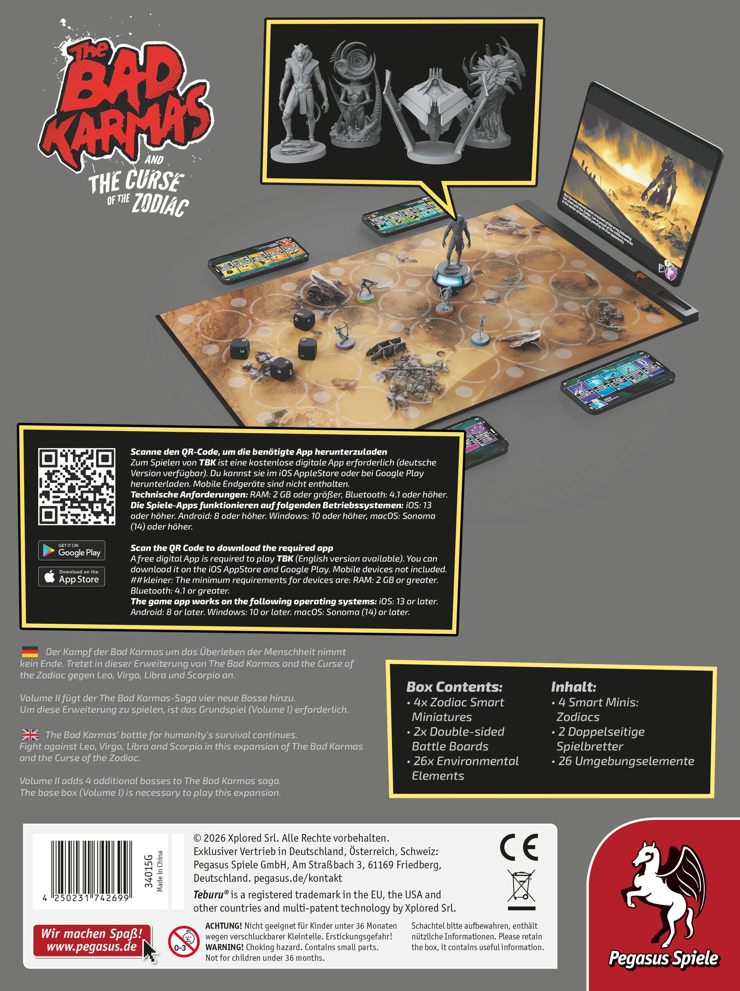 Der Kampf der Bad Karmas um das Überleben der Menschheit nimmt kein Ende. In dieser Erweiterung von The Bad Karmas and the Curse of the Zodiac treten die Spielenden gegen Leo, Virgo, Libra und Scorpio an. Volume 2 fügt der The Bad Karmas-Saga vier neue Bosse hinzu. Um diese Erweiterung zu Spielen ist das Grundspiel (Volume 1) erforderlich. Dies ist eine Erweiterung. Zum Spielen werden das Teburu Board und das Grundspiel The Bad Karmas and the Curse of the Zodiac Vol. 1 benötigt. Zum Spielen von TBK ist eine kostenlose digitale App erforderlich (deutsche Version verfügbar).
