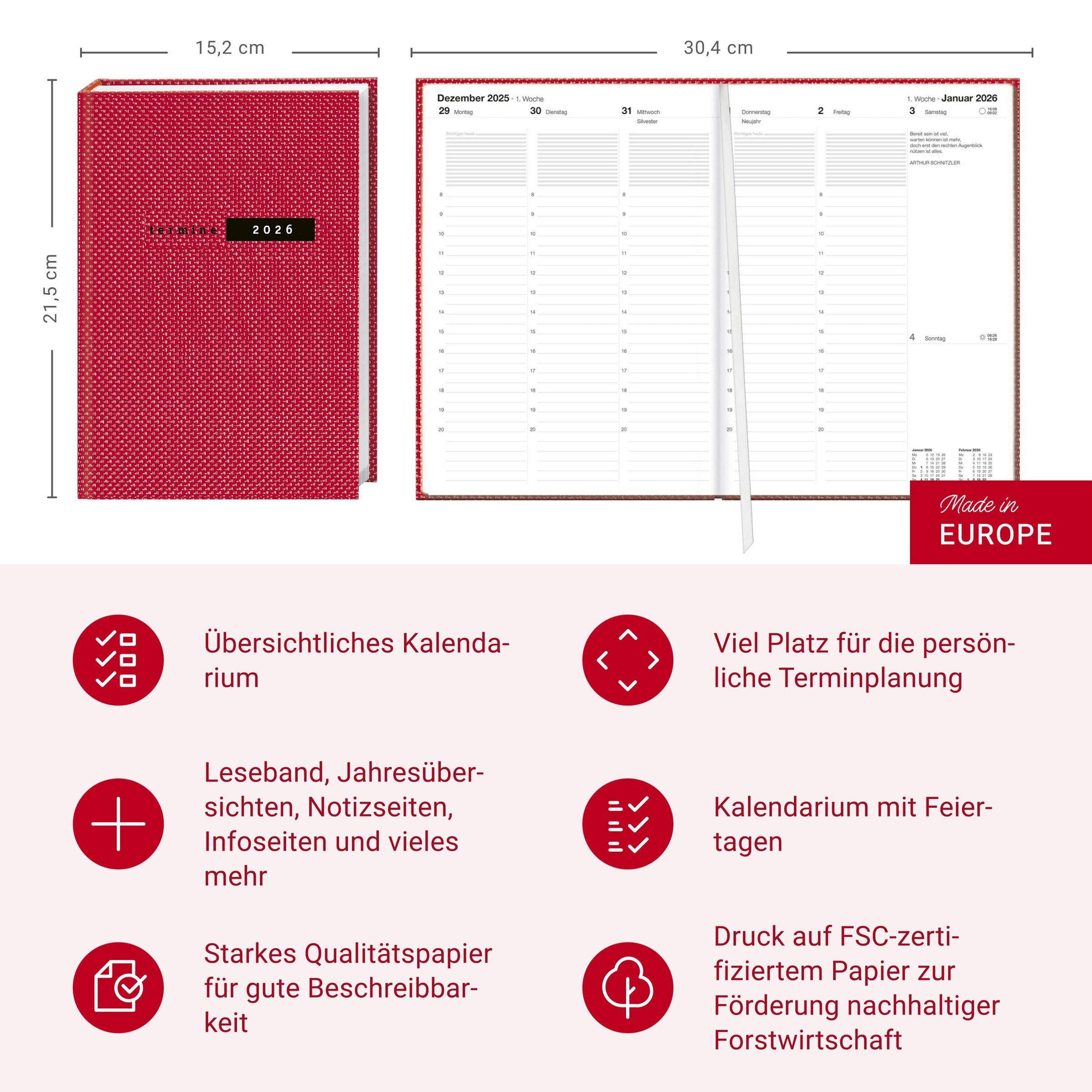 Der Allrounder: Das Kalenderbuch 2026 im schick strukturierten Rot