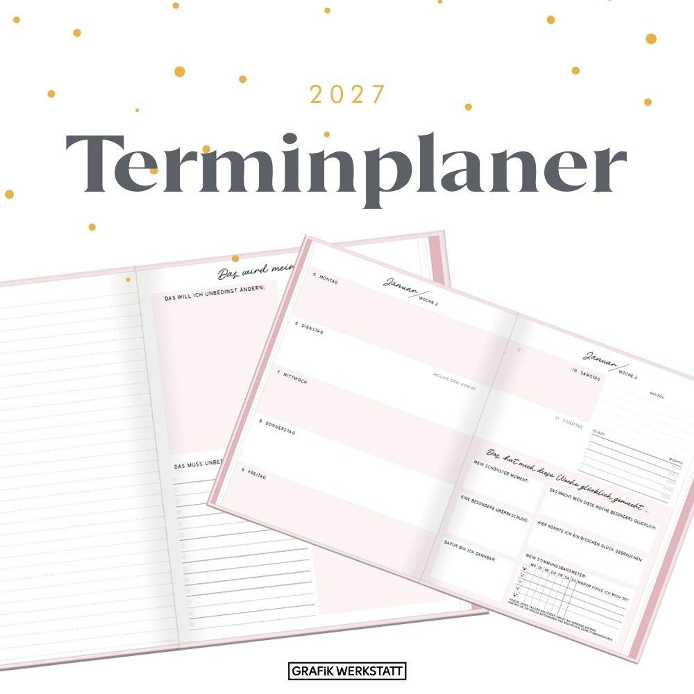 Mit diesem Terminplaner kannst du das Jahr 2027 übersichtlich und einfach planen. Dank der Wochenübersicht auf einer Doppelseite, viel Platz für Notizen und einem extra Bereich für Tagesprotokolle zum täglichen Dokumentieren verschiedener Gefühlslagen bietet dir dieser Taschenkalender einen umfassenden Jahresplaner inklusive Tagebuch. Motivierende Sprüche und viel Platz für Tagebucheinträge helfen dir dabei, deine Gedanken und Wünsche das ganze Jahr über im Blick zu behalten.
