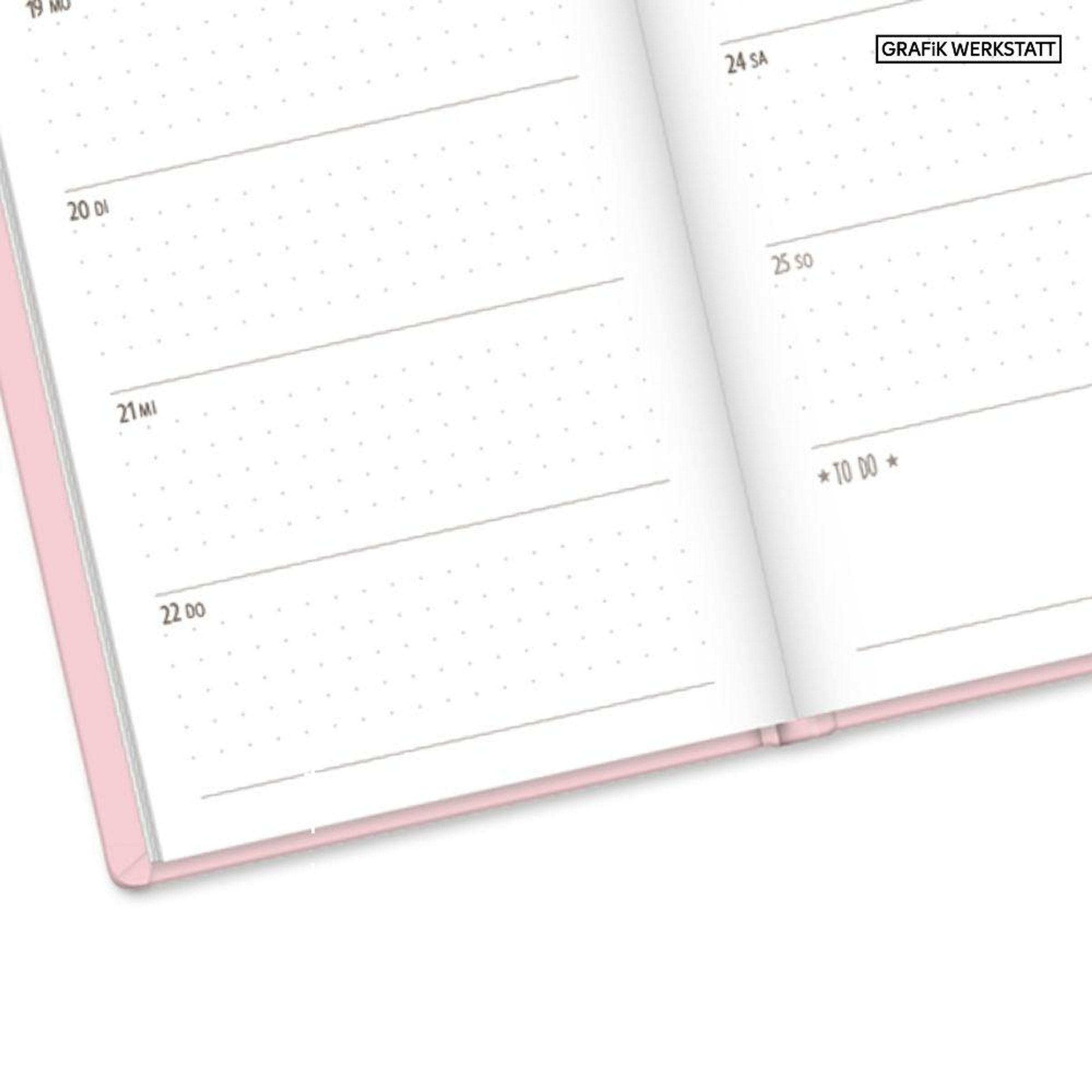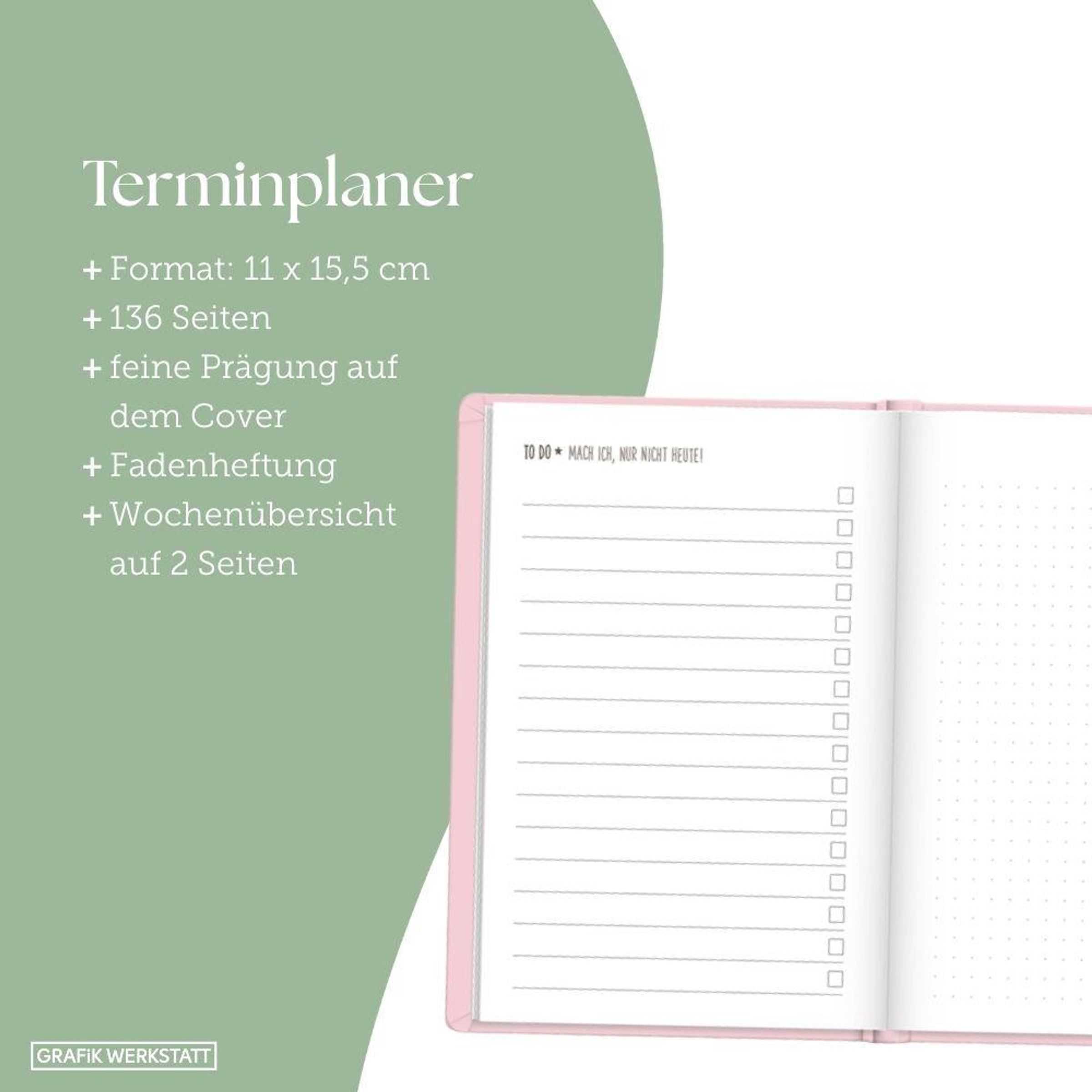 Mit diesem kleinen Terminplaner kannst du das Jahr 2027 strukturiert und einfach planen. Dank der Wochenübersicht auf einer Doppelseite, viel Platz für Notizen und einem Satin-Lesezeichen verlierst du niemals den Überblick. Eine Jahres- & Monatsvorschau auf einer Seite bietet dir die Möglichkeit das Jahr 2027 optimal zu planen.