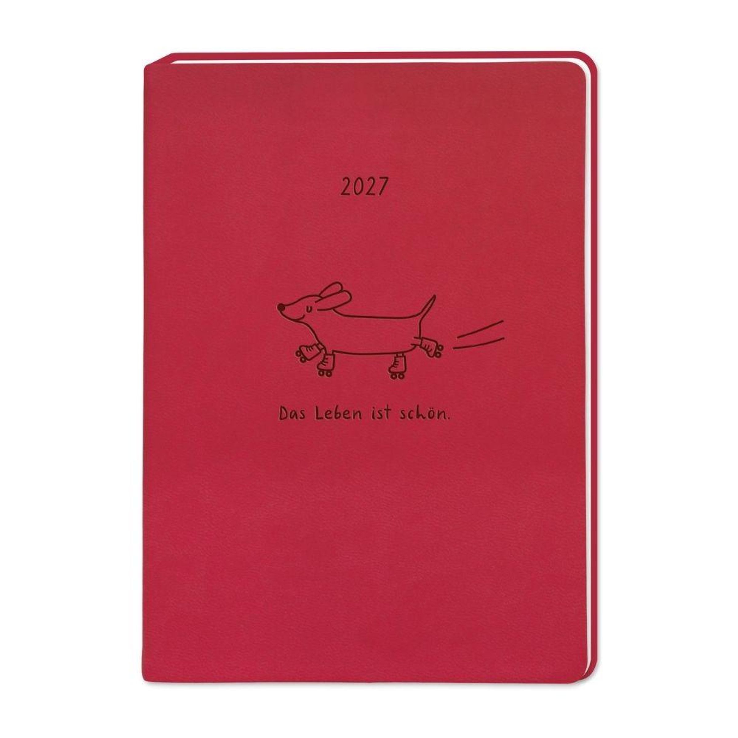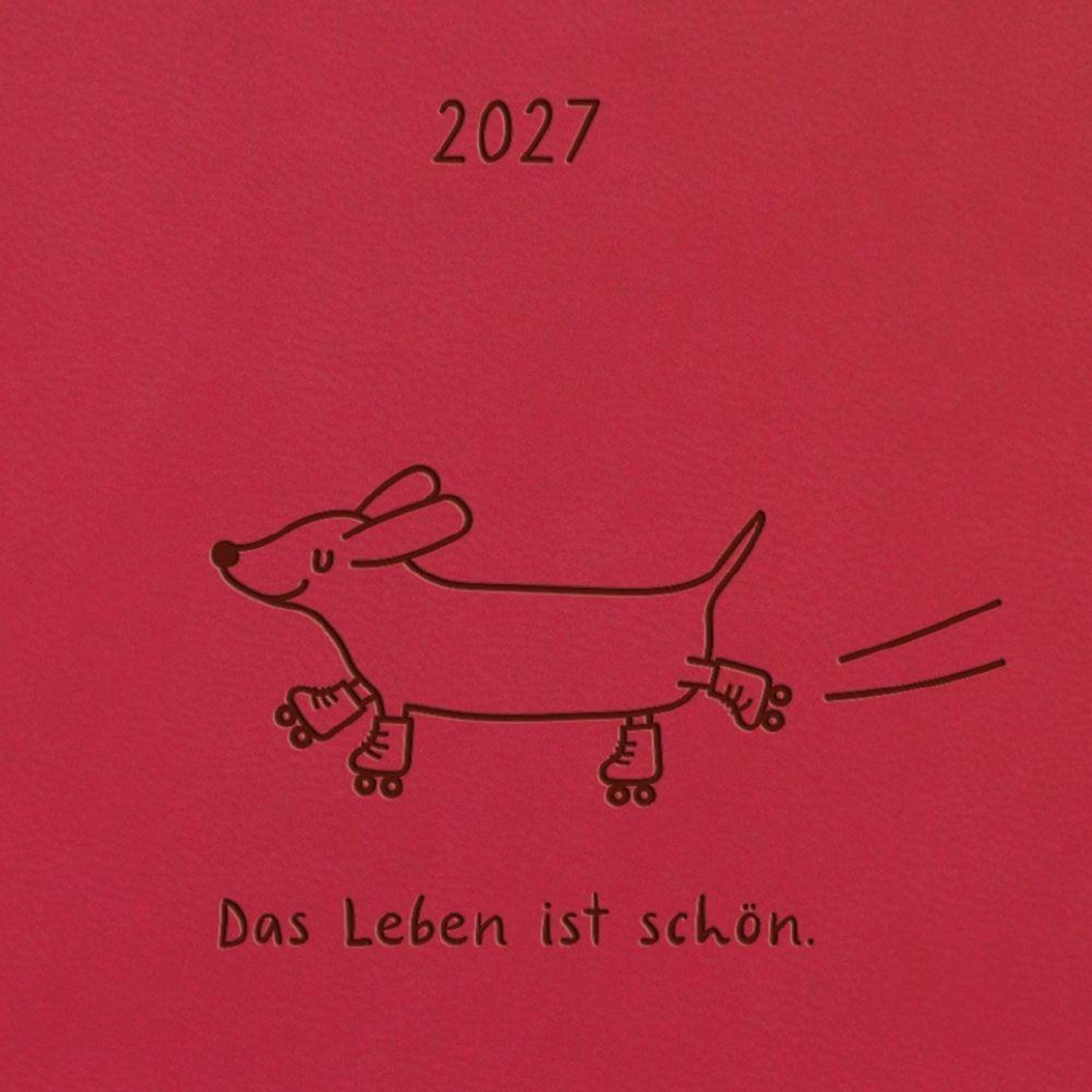 „2027. Das Leben ist schön.“ Auf einem roten Hintergrund eine Zeichnung von einem Hund auf Rollschuhen., Buch