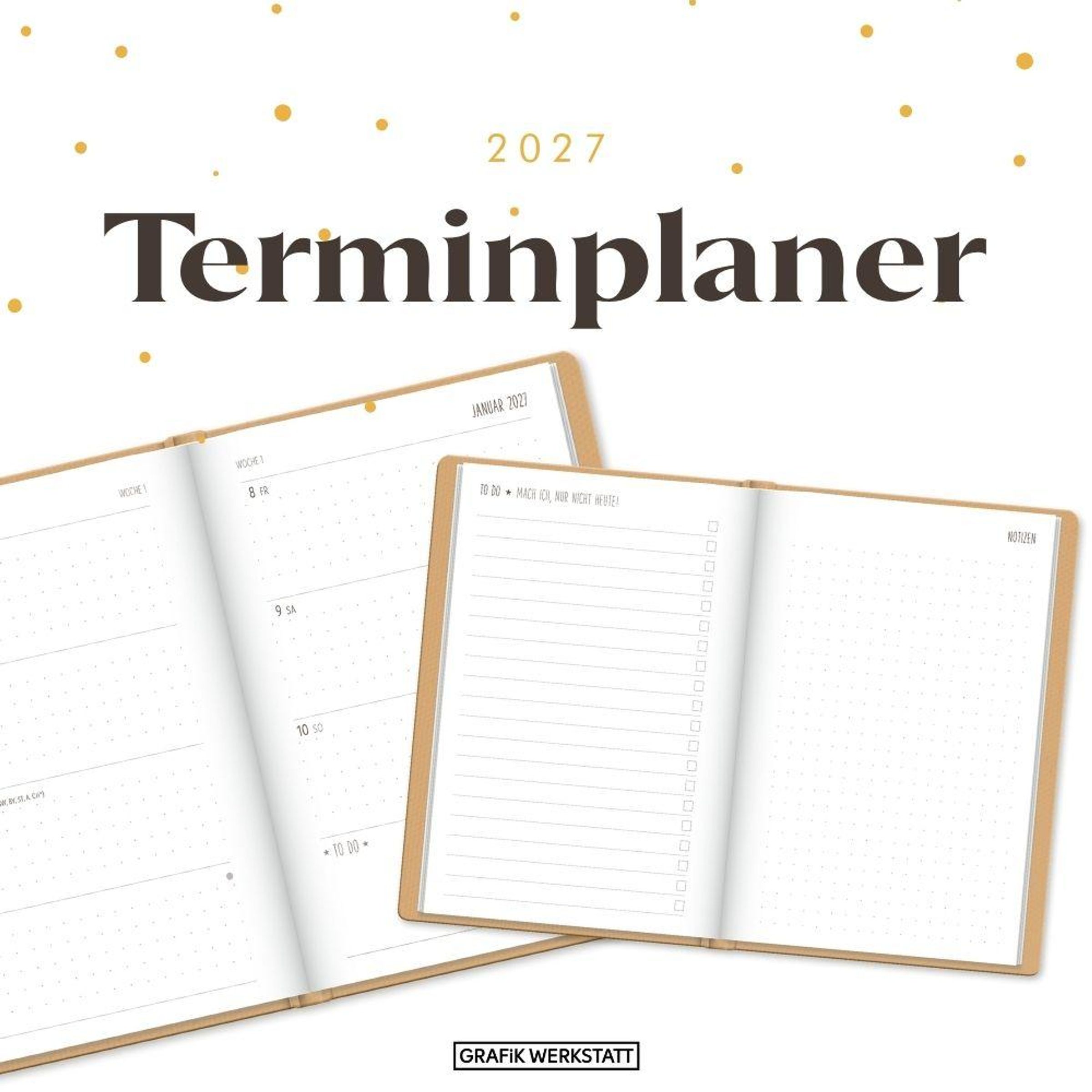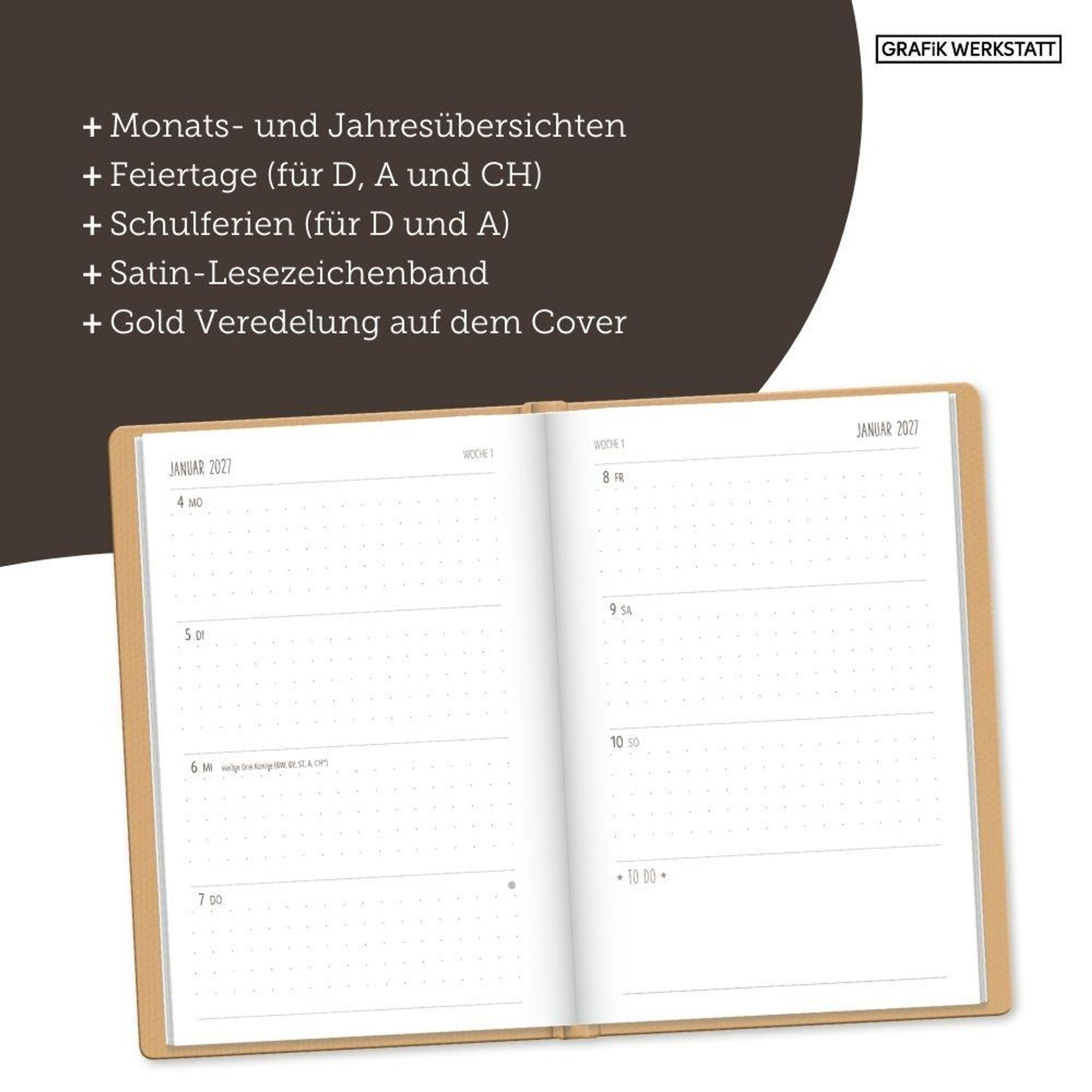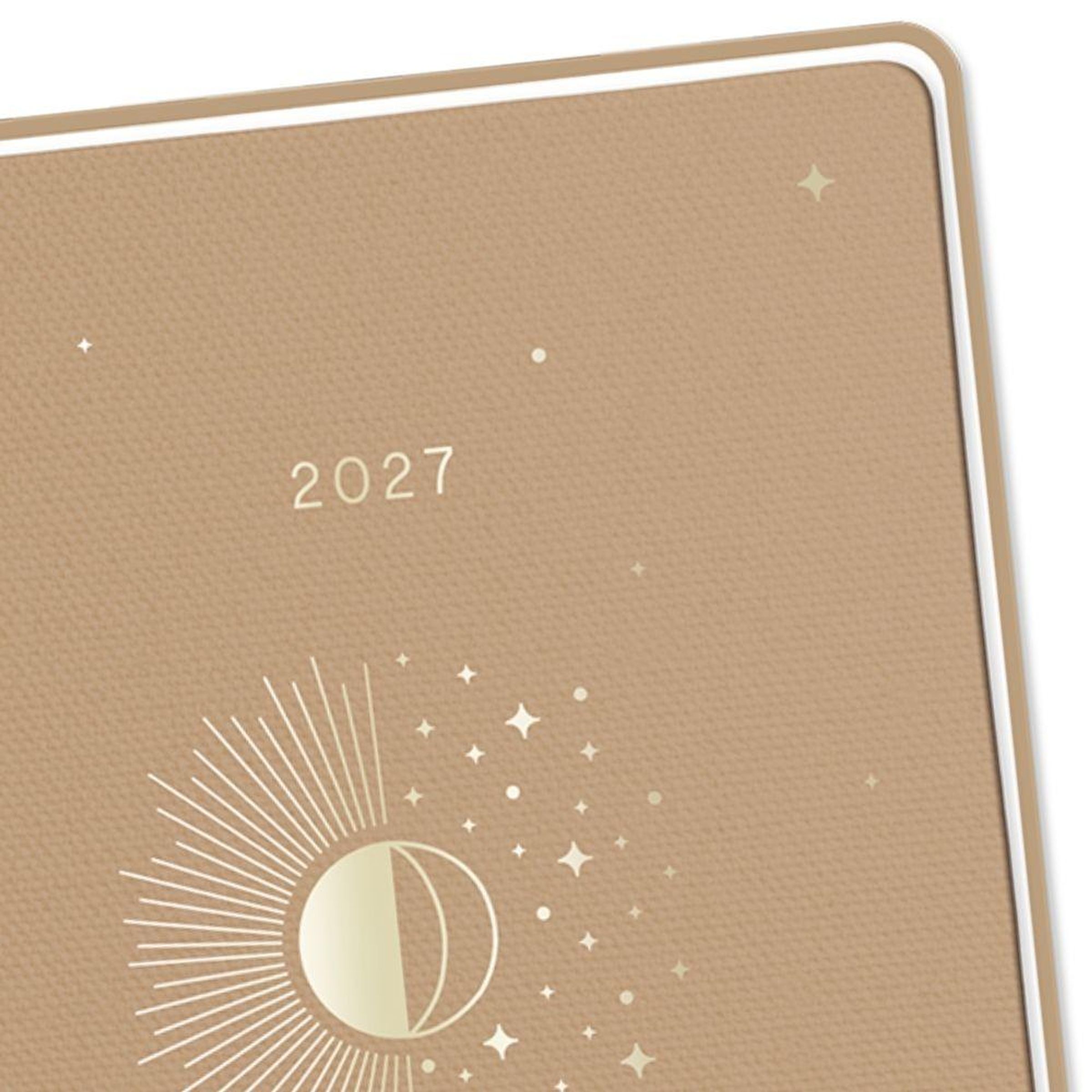 Ein beige Notizbuch mit "2027" und einem stilisierten Sonnen- und Mond-Design in der Mitte., Kalender