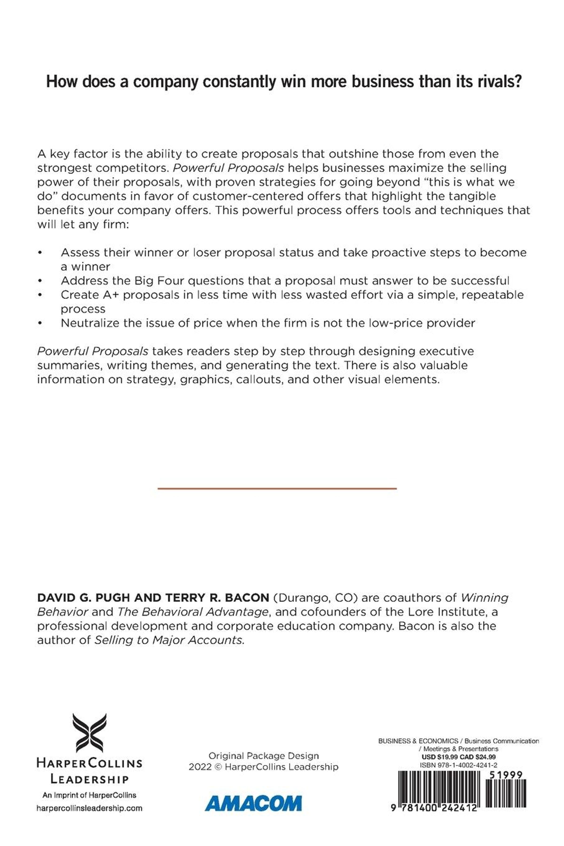 How does a company constantly win more business than its rivals? A key factor is the ability to create proposals that outshine those from even the strongest competitors. Powerful Proposals helps businesses maximize the selling power of their proposals, with proven strategies for going beyond "this is what we do" documents in favor of customer-centered offers that highlight the tangible benefits your company offers. This helpful resource offers tools and techniques that will let any firm: assess their ""winner or loser"" proposal status and take proactive steps to become a winner address the ""Big Four"" questions that a proposal must answer to be successful create ""A+"" proposals in less time with less wasted effort via a simple, repeatable process neutralize the issue of price when the firm is not the low-price provider