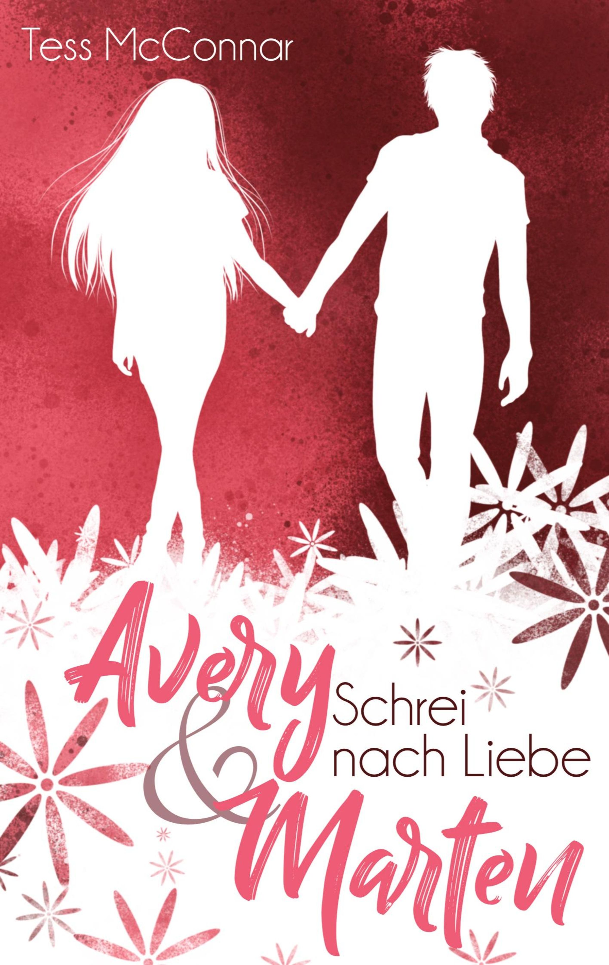 Titel: "Avery & Marten: Schrei nach Liebe", Autor: Tess McConnar. Zwei Gestalten halten Händchen vor rotem Hintergrund., Buch