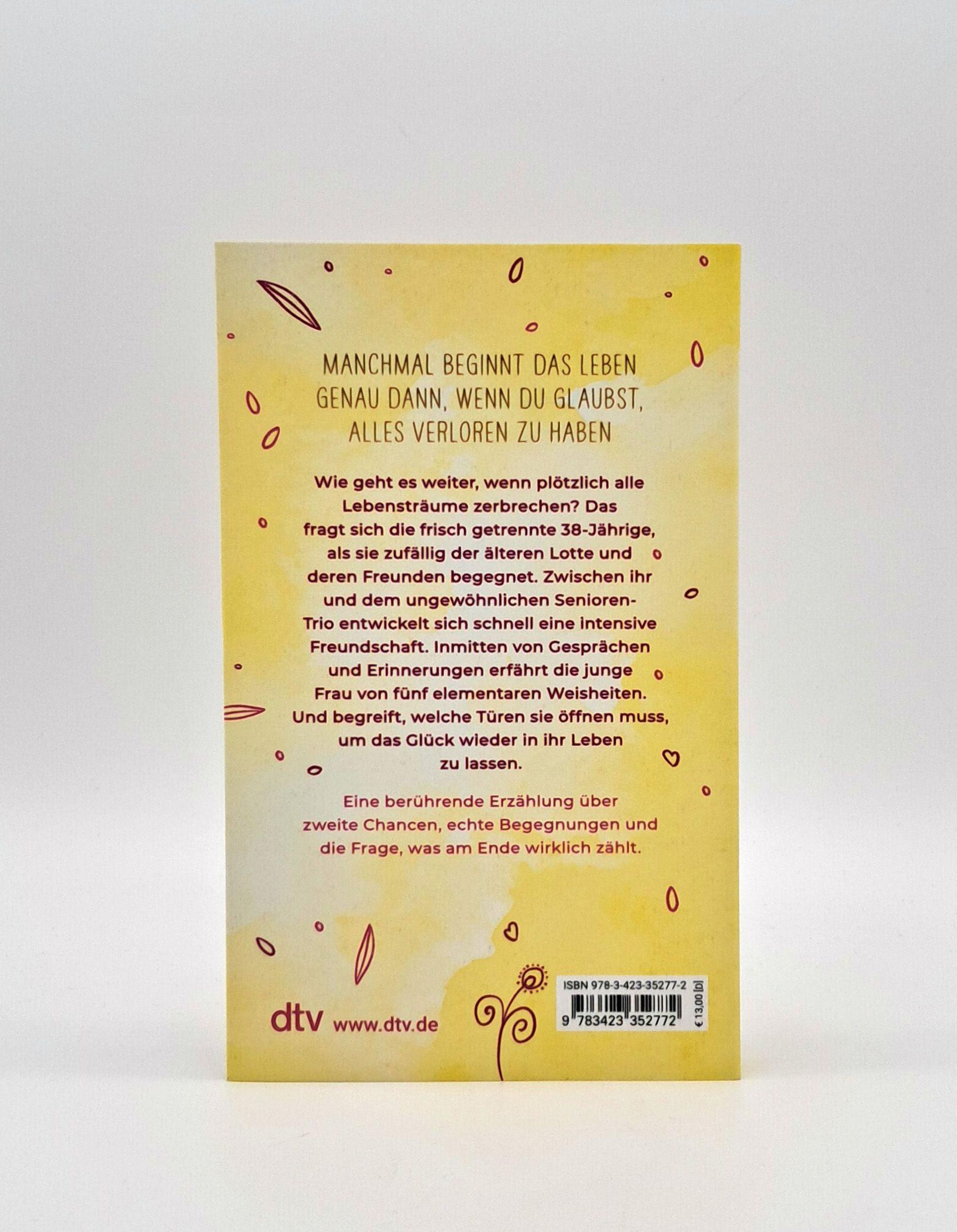 Wie geht es weiter, wenn plötzlich alle Lebensträume wie ein Kartenhaus in sich zusammenfallen? Das fragt sich die frisch getrennte 38-Jährige, als sie zufällig der älteren Lotte und deren Freunden Anita und Johann begegnet. Zwischen ihr und dem ungewöhnlichen Senioren-Trio entwickelt sich eine intensive Freundschaft. In Gesprächen voller Wärme, Humor und Tiefgang offenbaren die drei ihre größten Lebenslektionen - bewegende Geschichten über verpasste Chancen, echte Freundschaft und den Mut, dem Herzen zu folgen. Langsam versteht die junge Frau, welche Türen sie öffnen muss, um das Glück wieder in ihr Leben zu lassen.