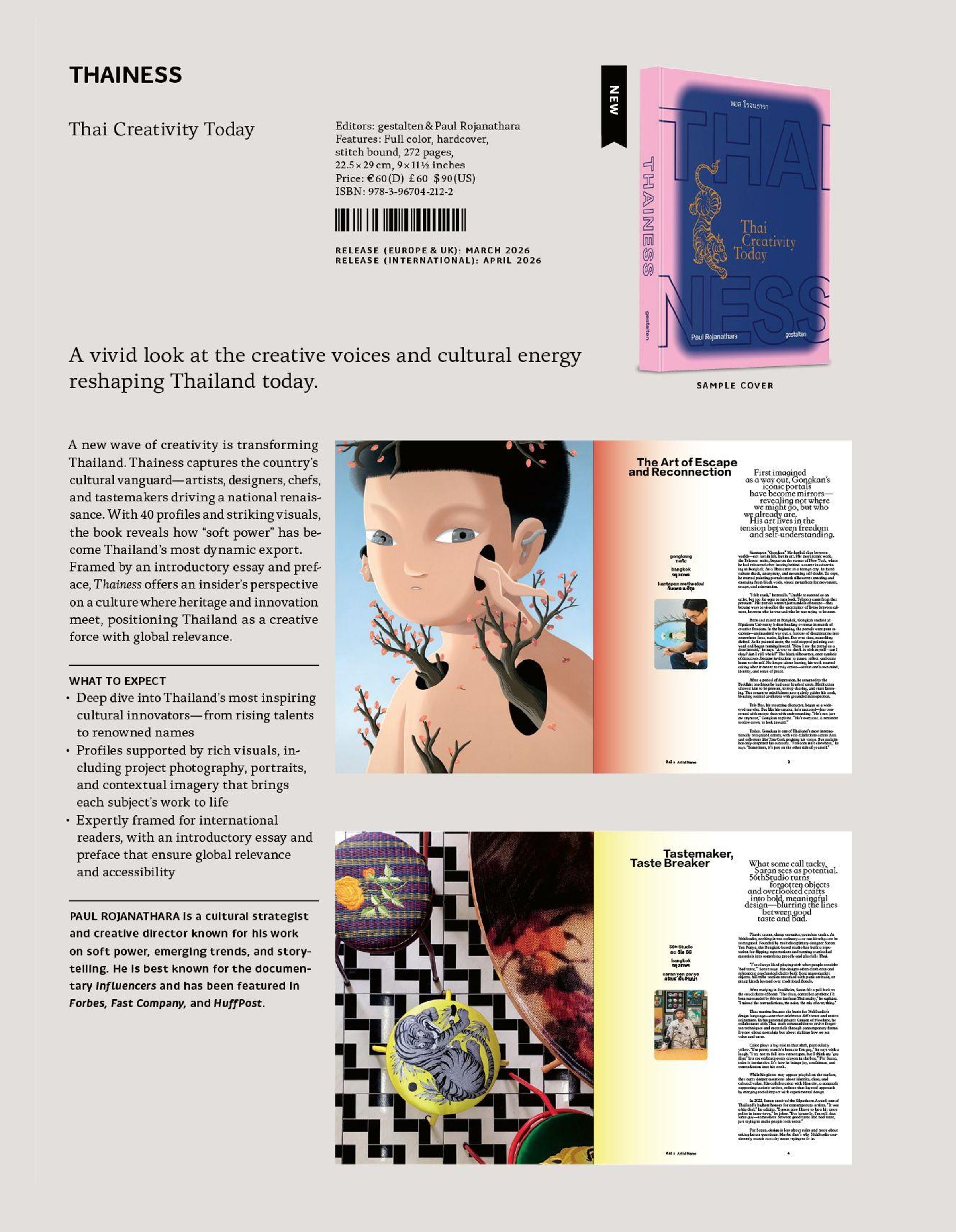 Thainess ist ein Buch für alle, die Inspiration suchen. Es porträtiert die Köpfe, die Thailands kreative Szene heute prägen - Designer: innen, Künstler: innen, Köch: innen und Vordenker: innen, die Tradition und Gegenwart auf unerwartete Weise verbinden. In 40 reich bebilderten Porträts eröffnet das Buch einen neuen Blick auf ein Land, das lange unterschätzt wurde, und zeigt, warum Thailand heute als Bühne für Ideen gilt, die weit über seine Grenzen hinaus wirken.