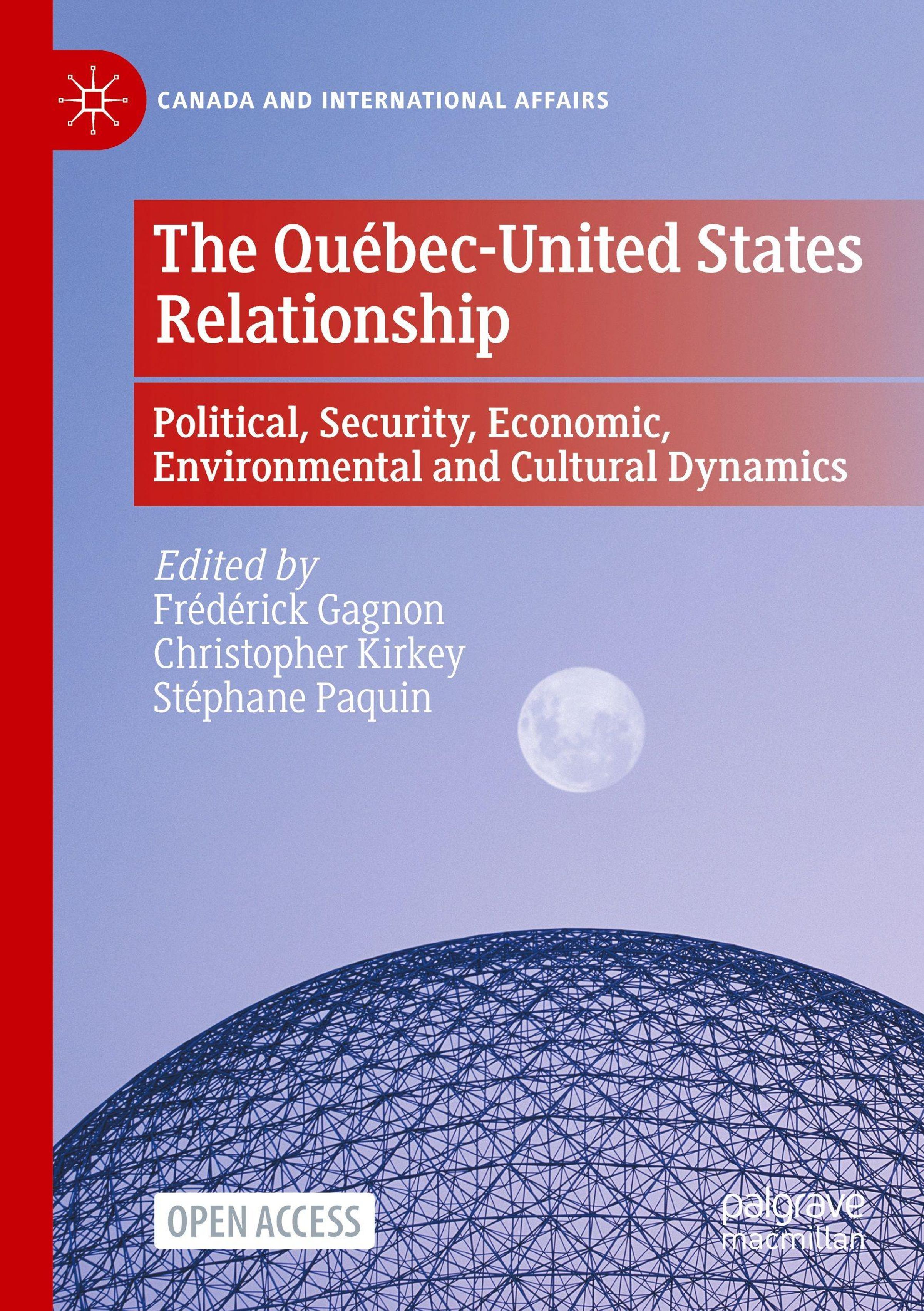 "The Québec-United States Relationship", rote Leiste oben, Netzstruktur im Vordergrund, Mond am Himmel, blauer Hintergrund., Buch