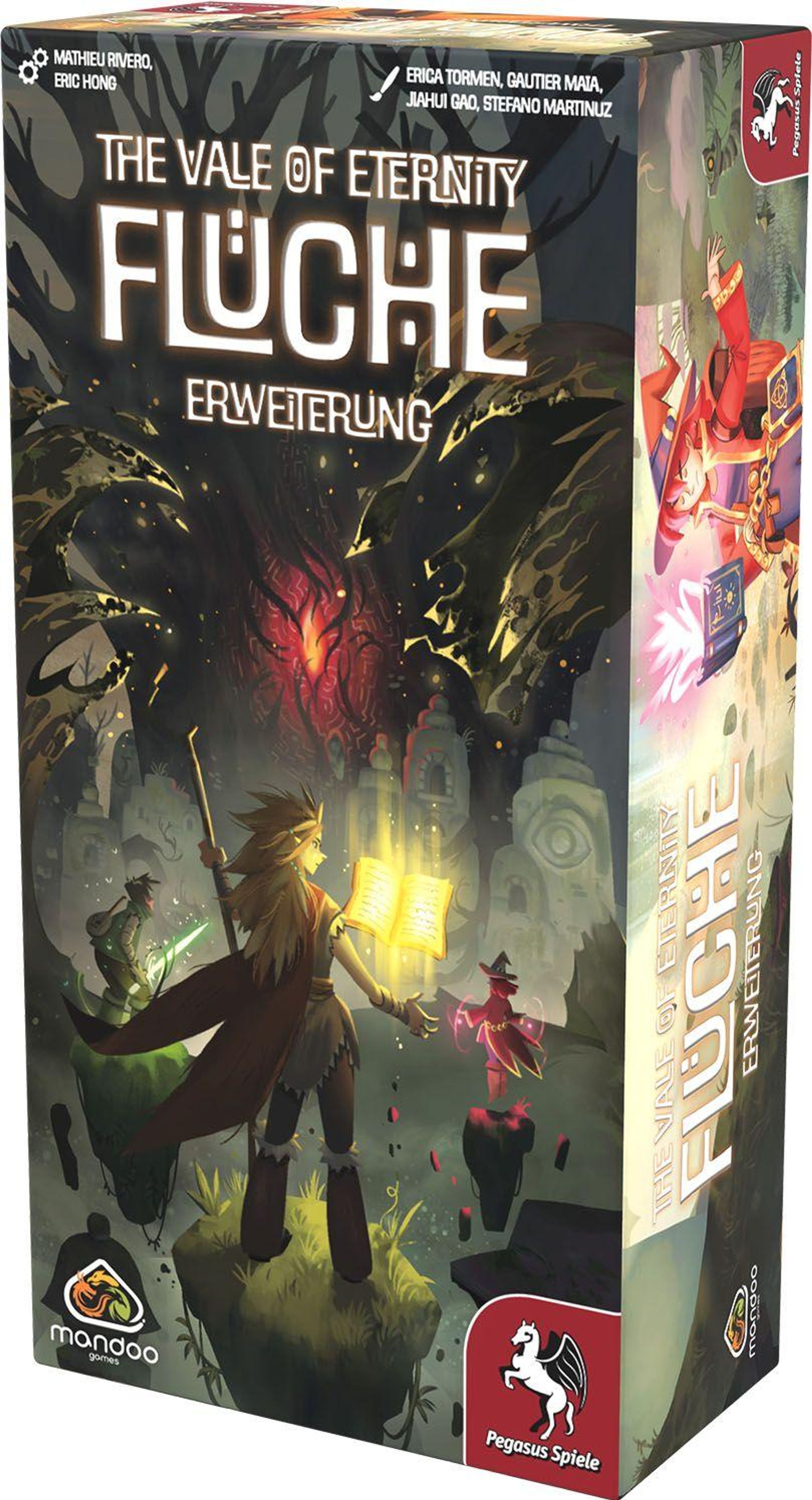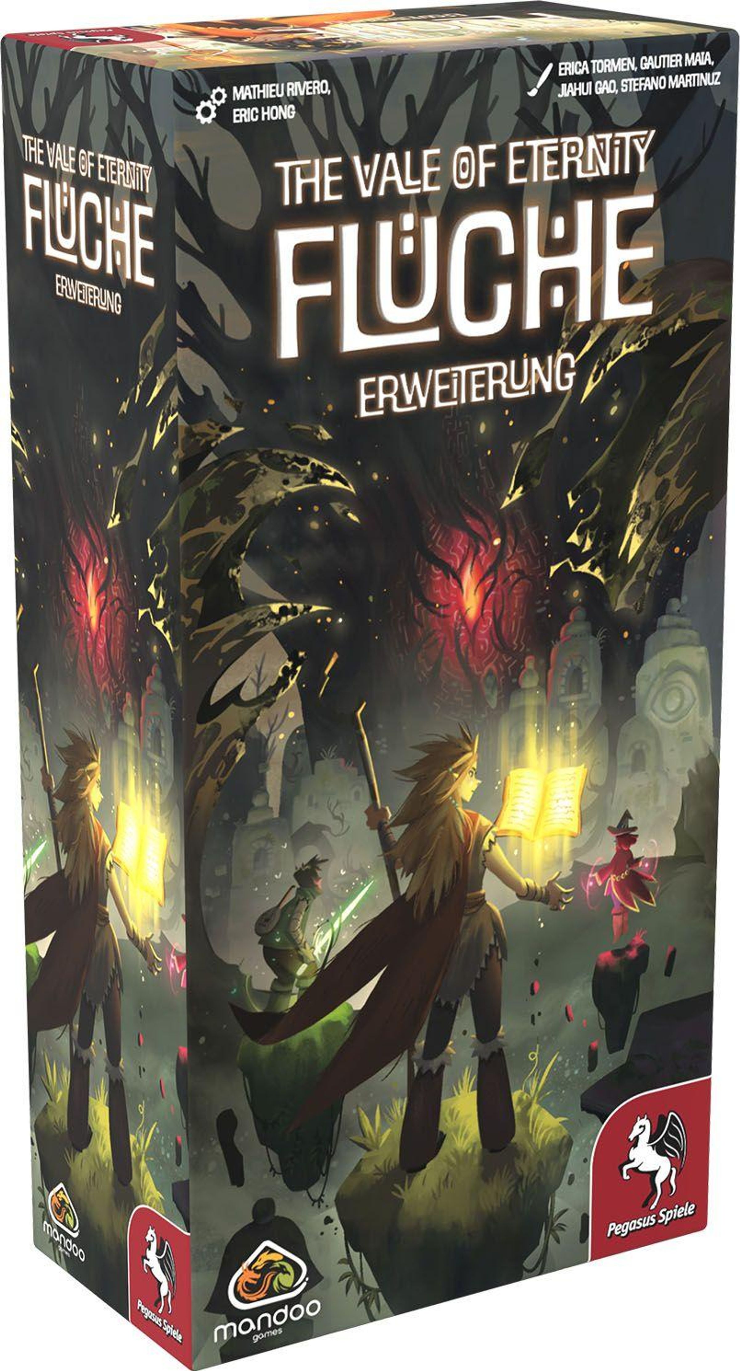 Ein dunkler Schatten ist aufgezogen und bedroht seither das Tal des Drachen Eternity. Ein verfluchter Baum hat seine verdorbenen Wurzeln tief ins Erdreich geschlagen und befällt die Kreaturen mit uralten Flüchen. In der zweiten Erweiterung für The Vale of Eternity , Flüche , ist es an den Spielenden, sich dem Bösen zu stellen und die Kreaturen von Flüchen zu erlösen. Hierzu schlüpfen sie in die Rolle von Bändiger*innen mit individuellen Fähigkeiten und handeln jede Runde eine Fluchphase ab, in der sie Flüche von Kreaturen auf sich selbst übertragen. Neben den Fluchmarkern kommen auch neue Kreaturen ins Spiel, die mit Flüchen interagieren können. Talismane schützen zusätzlich, können aber alternativ auch Kosten für beschworene Kreaturen reduzieren. The Vale of Eternity: Flüche ist mit der ersten Erweiterung, Artefakte, kombinierbar.