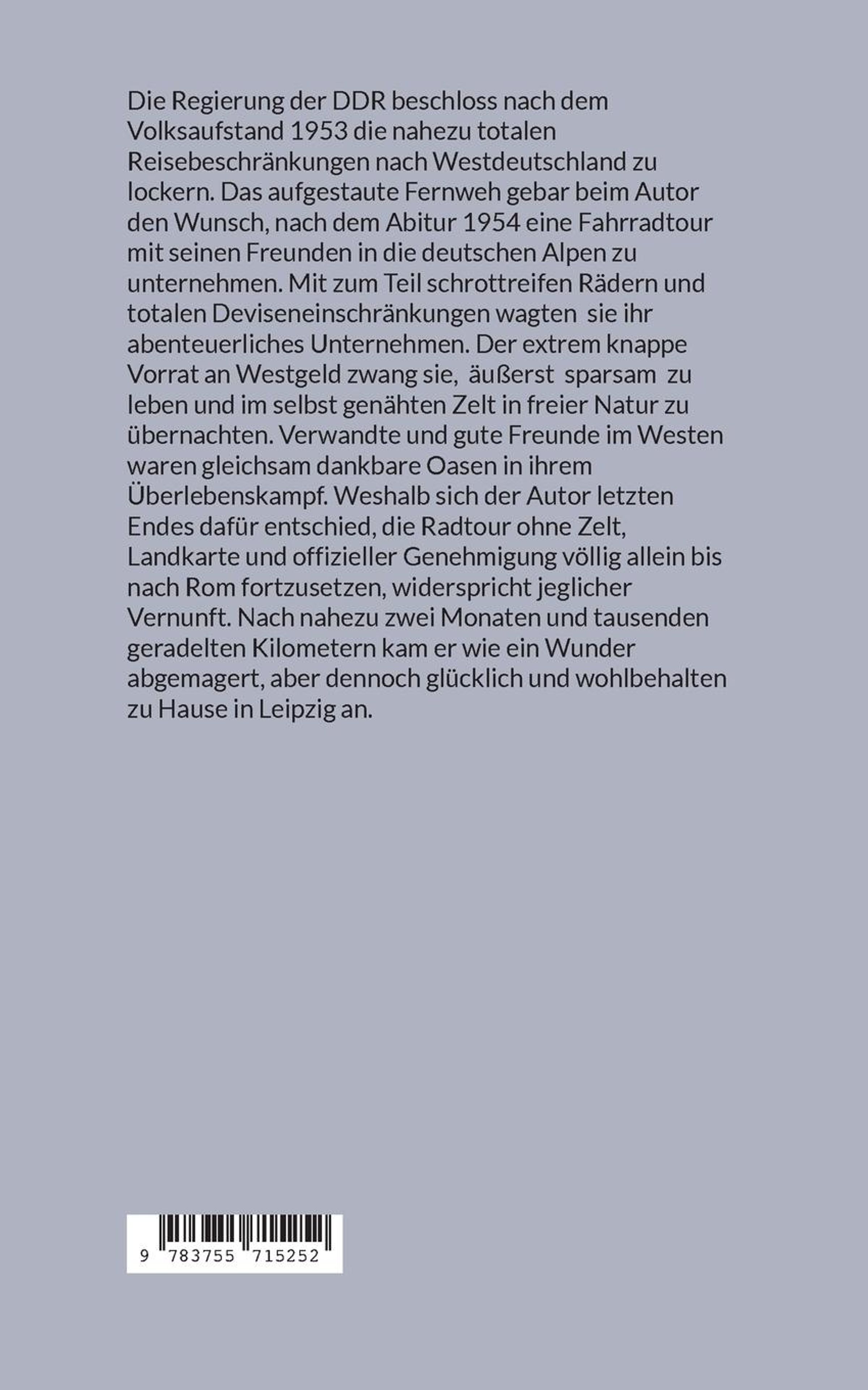 Die Regierung der DDR beschloss nach dem Volksaufstand 1953 die nahezu totalen Reisebeschränkungen nach Westdeutschland zu lockern. Das aufgestaute Fernweh gebar beim Autor den Wunsch, nach dem Abitur 1954 eine Fahrradtour mit seinen Freunden in die deutschen Alpen zu unternehmen. Mit zum Teil schrottreifen Rädern und totalen Deviseneinschränkungen wagten sie ihr abenteuerliches Unternehmen. Der extrem knappe Vorrat an Westgeld zwang sie, äußerst sparsam zu leben und im selbst genähten Zelt in freier Natur zu übernachten. Verwandte und gute Freunde im Westen waren gleichsam dankbare Oasen in ihrem Überlebenskampf. Weshalb sich der Autor letzten Endes dafür entschied, die Radtour ohne Zelt, Landkarte und offizieller Genehmigung völlig allein bis nach Rom fortzusetzen, widerspricht jeglicher Vernunft. Nach nahezu zwei Monaten und tausenden geradelten Kilometern kam er wie ein Wunder abgemagert, aber dennoch glücklich und wohlbehalten zu Hause in Leipzig an.