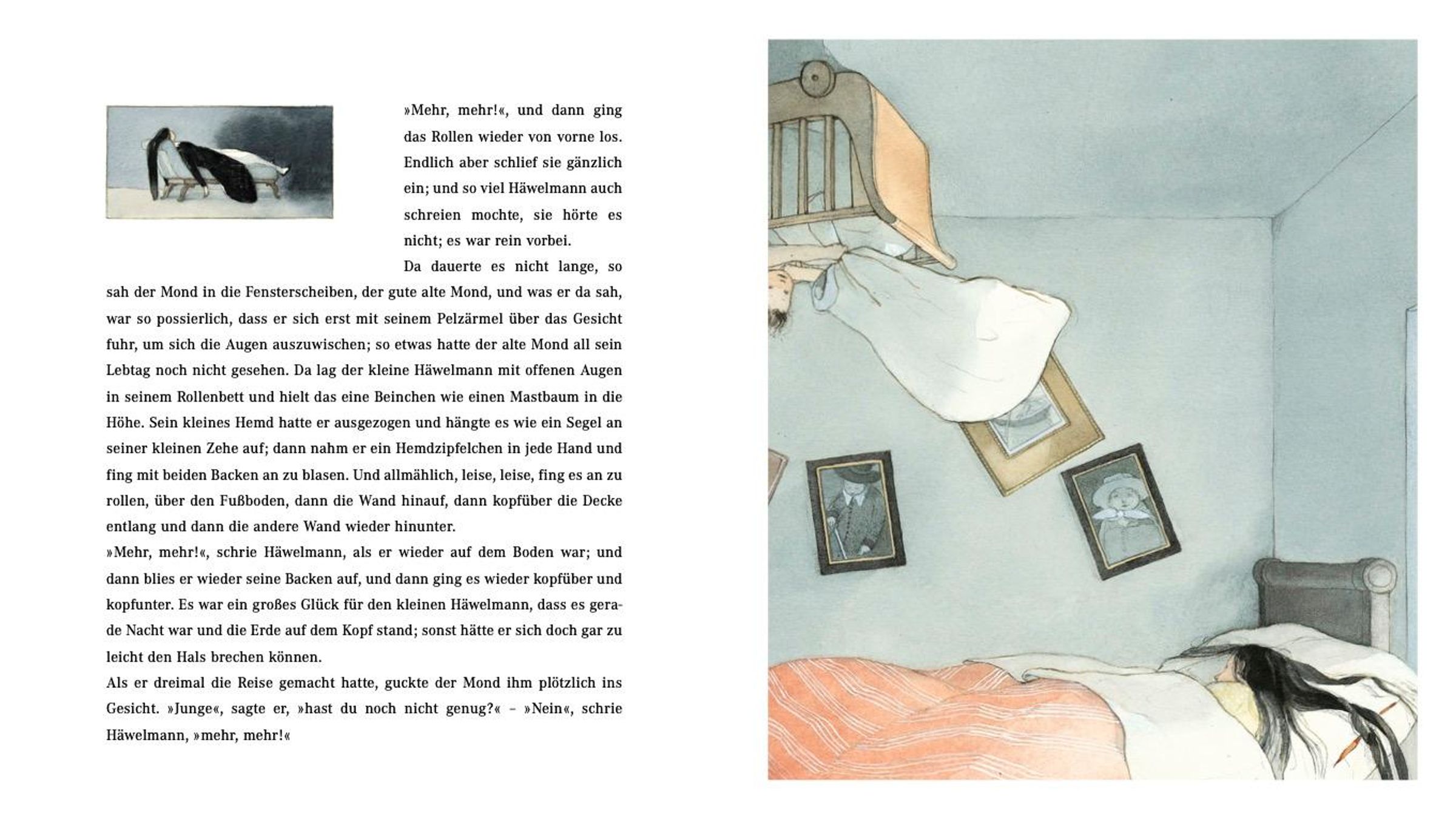 Der kleine Häwelmann kann nicht einschlafen. Er möchte, dass seine Mutter ihn in seinem Bettchen herumschiebt. Doch die schläft schon. Da verwandelt der Junge sein Bett in ein Traumschiff, sein Nachthemd wird zum Segel. Der Mond selbst schickt einen Lichtstrahl, damit der kleine Häwelmann zum Fenster hinausfahren kann. Eine fantastische Reise beginnt. Sie führt das Kind durch die Stadt und den Wald bis zu den Himmelssternen. Theodor Storms berühmte Geschichte vom kleinen Häwelmann gehört zur Weltliteratur für Kinder. Die österreichische Illustratorin Lisbeth Zwerger schuf dazu magische Bilder, die in dieser Neuausgabe bestens zur Geltung kommen. Bilderbücher Weltliteratur für