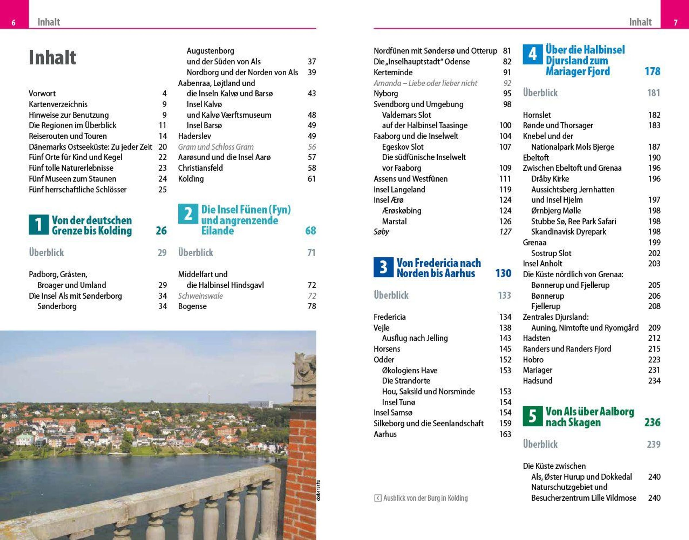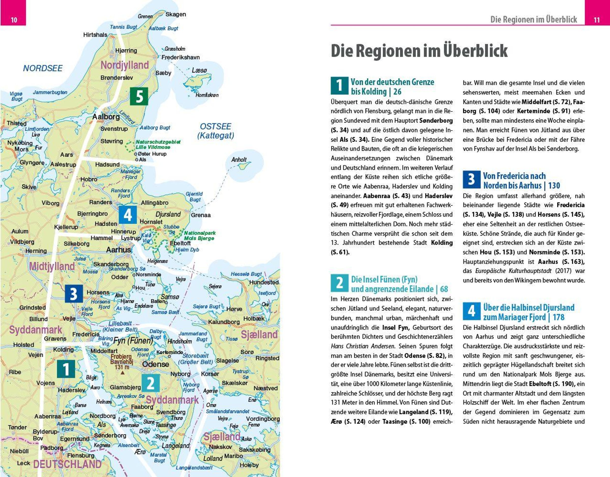 Übersichtsseiten mit Beschreibungen aller Regionen: Von der deutschen Grenze bis Kolding, die Insel Fünen (Fyn) und angrenzende Eilande, von Fredericia nach Norden bis Aarhus, über die Halbinsel Djursland zum Mariager Fjord, von Als über Aalborg nach Skagen