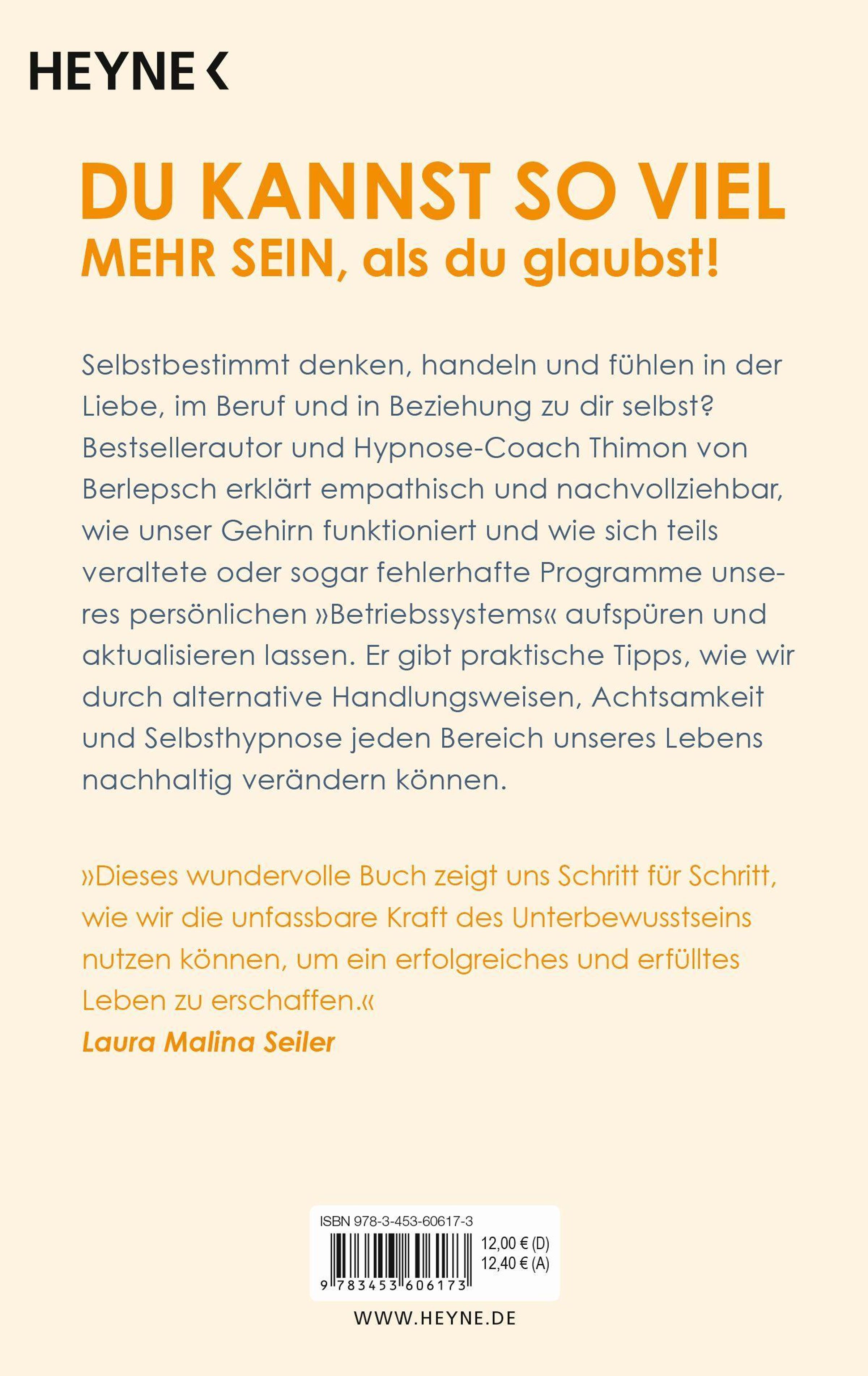 Selbstbestimmt und ausgeglichen denken, handeln und fühlen in der Liebe, im Beruf und in Beziehung zu dir selbst? Wie das Betriebssystem eines Computers arbeitet unser Unterbewusstsein mit Programmen aus unserer Kindheit, die uns das Leben leichter machen sollen. Leider sind manche davon schon lange veraltet oder sogar fehlerhaft. So verrennen wir uns in limitierende Glaubenssätze, schlechte Gewohnheiten oder wiederkehrende Ängste. Wir sind unzufrieden und gestresst. Zeit für ein Update! Spiegel-Bestsellerautor und Hypnose-Coach Thimon von Berlepsch erklärt empathisch und leicht verständlich, wie unser Gehirn funktioniert und wie sich ungewollte Programme aufspüren und aktualisieren lassen. Er gibt praktische Tipps, wie wir durch alternative Handlungsweisen, Achtsamkeit und Selbsthypnose jeden Bereich unseres Lebens nachhaltig verändern können.