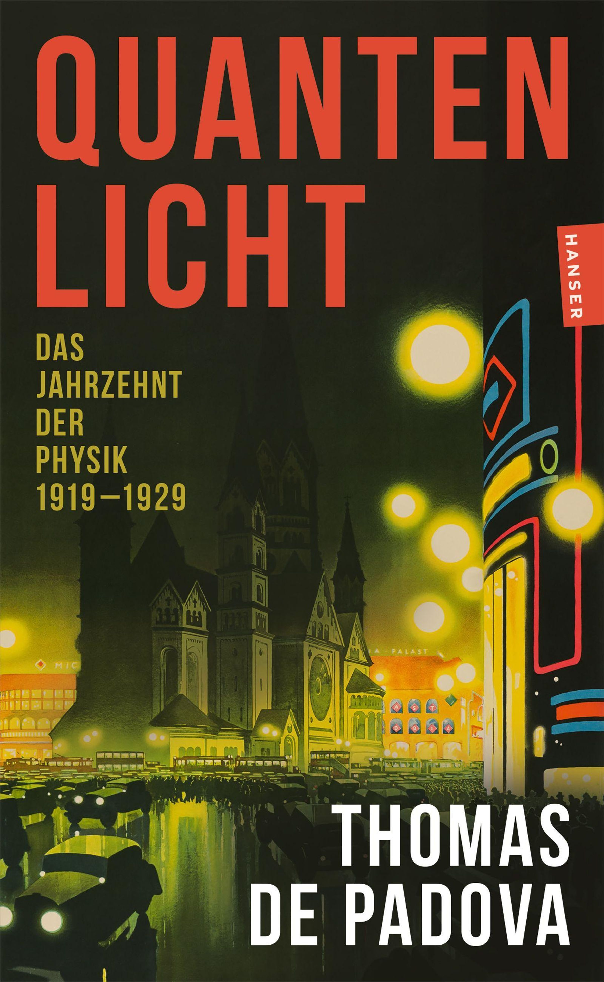 „QUANTENLICHT. Das Jahrzehnt der Physik 1919–1929“. Autor: Thomas de Padova. Beleuchtete Stadtansicht mit Kirche., Buch