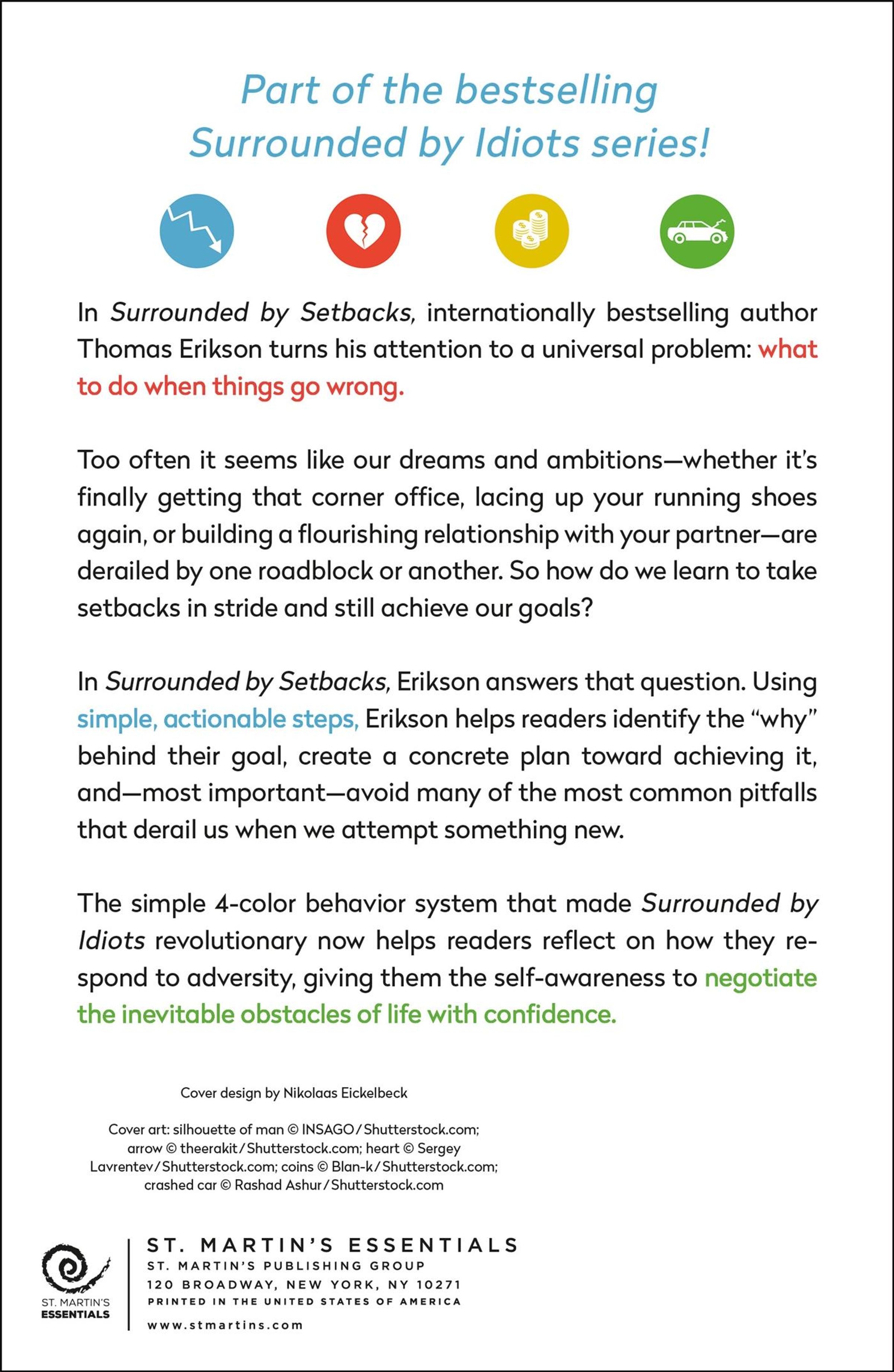 In Surrounded by Setbacks , Erikson answers that question. Using simple, actionable steps, Erikson helps readers identify the "why" behind their goal, create a concrete plan towards achieving it, and-most importantly-avoid many of the most common pitfalls that derail us when we attempt something new. The simple 4-color behavior system that made Surrounded by Idiotsrevolutionary now helps readers reflect on how they respond to adversity, giving them the self-awareness to negotiate the inevitable obstacles of life with confidence.