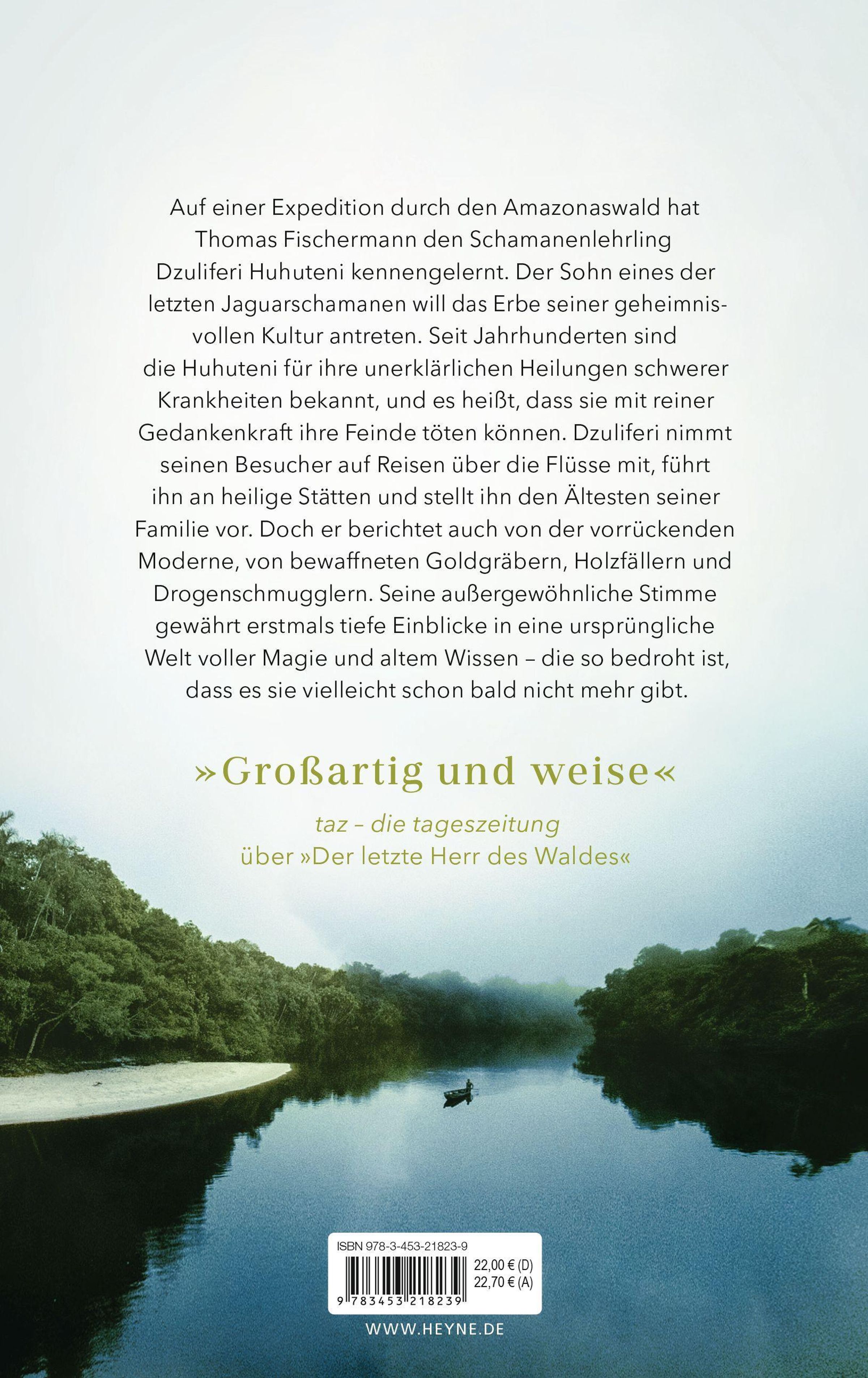 Auf einer Expedition durch den Amazonaswald hat Thomas Fischermann den Schamanenlehrling Dzuliferi Huhuteni kennengelernt. Der Sohn eines der letzten Jaguarschamanen will das Erbe seiner geheimnisvollen Kultur antreten. Seit Jahrhunderten sind die Huhuteni für ihre unerklärlichen Heilungen schwerer Krankheiten bekannt, doch es heißt auch, dass sie nur durch Gedankenkraft ihre Feinde töten können. Dzuliferi erzählt in diesem Buch seine Geschichte und die seines Volkes, aber auch von der vorrückenden Moderne, bewaffneten Goldgräbern, Holzfällern und Drogenschmugglern, die zunehmend in diesem Teil des Waldes gesichtet werden. Die außergewöhnliche Stimme des Schamanenlehrlings gewährt erstmals tiefe Einblicke in eine ursprüngliche Welt voller Magie und altem Wissen - die so bedroht ist, dass es sie vielleicht schon bald nicht mehr gibt.