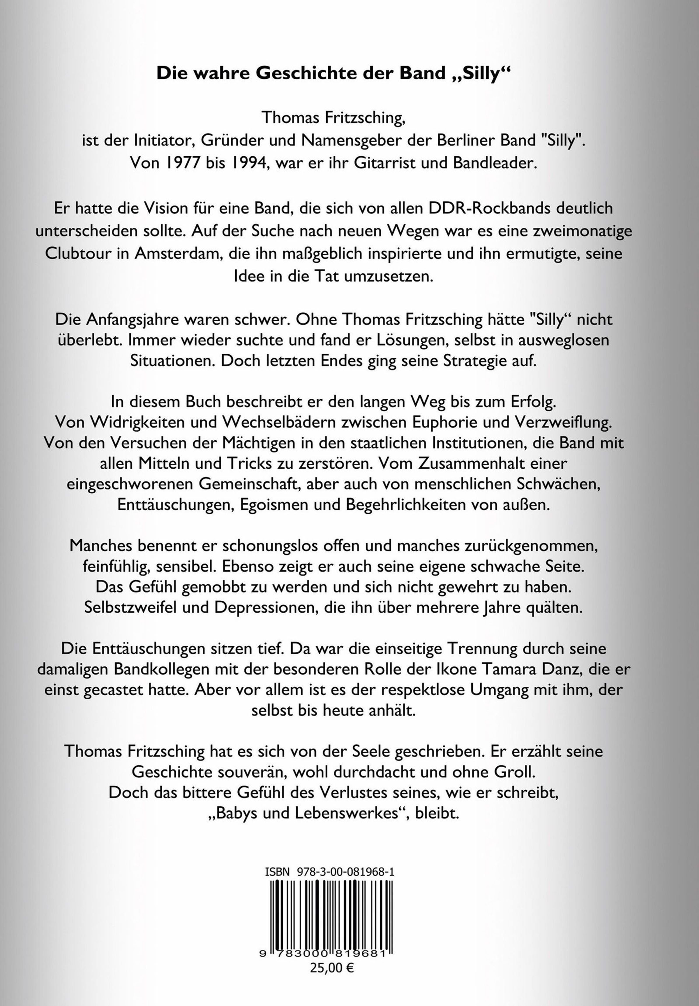 Die wahre Geschichte der Band „Silly“ Thomas Fritzsching ist der Initiator, Gründer und Namensgeber der Berliner Band "Silly". Von 1977 bis 1994, war er ihr Gitarrist und Bandleader. Er hatte die Vision für eine Band, die sich von allen DDR-Rockbands deutlich unterscheiden sollte. Auf der Suche nach neuen Wegen war es eine zweimonatige Clubtour in Amsterdam, die ihn maßgeblich inspirierte und ihn ermutigte, seine Idee in die Tat umzusetzen. Die Anfangsjahre waren schwer. Ohne Thomas Fritzsching hätte "Silly“ nicht überlebt. Immer wieder suchte und fand er Lösungen, selbst in ausweglosen Situationen. Doch letzten Endes ging seine Strategie auf. In diesem Buch beschreibt er den langen Weg bis zum Erfolg. Von Widrigkeiten und Wechselbädern zwischen Euphorie und Verzweiflung. Von den Versuchen der Mächtigen in den staatlichen Institutionen, die Band mit allen Mitteln und Tricks zu zerstören. Vom Zusammenhalt einer eingeschworenen Gemeinschaft, aber auch von menschlichen Schwächen, Enttäuschungen, Egoismen und Begehrlichkeiten von außen. Manches benennt er schonungslos offen und manches zurückgenommen, feinfühlig, sensibel. Ebenso zeigt er auch seine eigene schwache Seite. Das Gefühl, gemobbt zu werden und sich nicht gewehrt zu haben. Selbstzweifel und Depressionen, die ihn über mehrere Jahre quälten. Die Enttäuschungen sitzen tief.