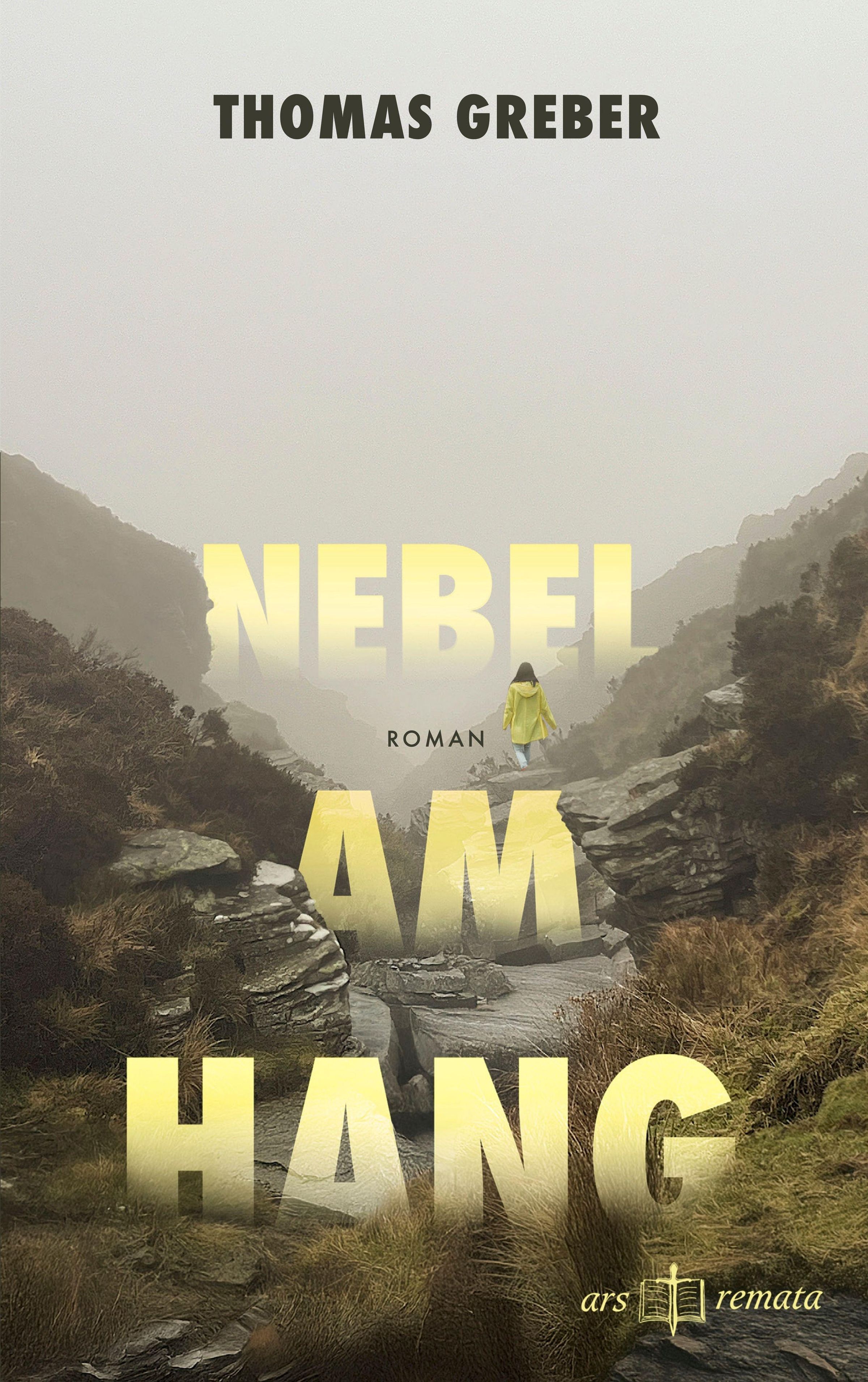 Oben steht "THOMAS GREBER", mittig "NEBEL AM HANG", darunter "ROMAN". Eine Person in gelber Jacke in nebliger Berglandschaft., Buch