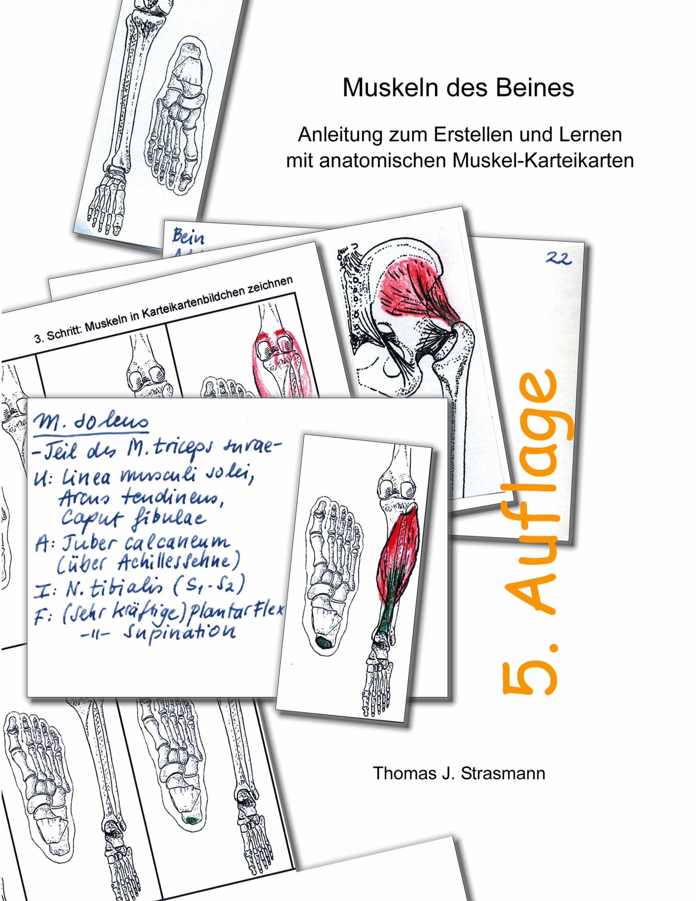 Die 7 Schritte zum Erstellen und Lernen mit anatomischen Muskelkarteikarten des Beines. Der 1. Schritt ist das Schreiben der Karteikarten. Das Buch gibt eine Anleitung und die Liste aller Beinmuskeln für insgesamt 50 Muskel-Karten (Ursprung, Ansatz, Innervation und Funktion). Der 2. Schritt, das Aufsuchen und Einzeichnen der Ursprünge und Ansätze in große Skelettbilder, ist wie ein anatomisches Malbuch gestaltet. Der 3. Schritt ist das Einzeichnen der Muskeln in die eigentlichen Karteikartenbilder. Hier sind für jede Karte mehr Bilder vorhanden, als eigentlich benötigt werden, falls man sich mal verzeichnet. Der 4. Schritt heißt: "Sich erstmal darüber freuen" und ist in der 3. Auflage mit Audio-Dateien bestückt: Lauschen Sie - und lernen Sie fast wie "im Schlaf". Der 5. Schritt, das "Ordnen und Fragen beantworten", zeigt, wie man richtig und erfolgreich mit solchen Karten lernt. Es wird erklärt, wie man eigene Prüfungsfragen entwickelt und es sind noch 100 typische Prüfungsfragen beigefügt. Der 6. Schritt befasst sich damit, wie man das alles zuverlässig ins Sekundäre Gedächtnis bekommt. Hier geht es um den Mandelkern, den Hippocampus und das Arbeitsgedächtnis. In diesem Kapitel lernt man "Pauken". Der 7. und letzte Schritt gibt noch ein paar Anregungen für Alltagsbeobachtungen der Muskeln des Beines.