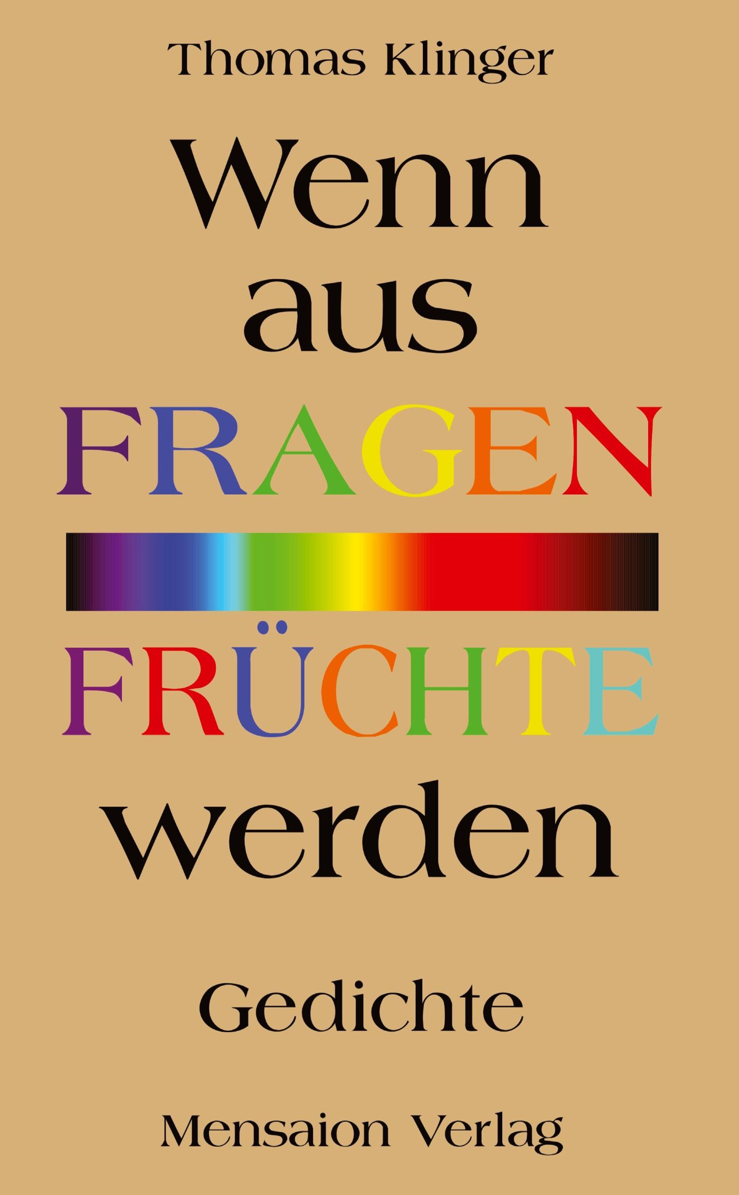 Buchtitel: "Wenn aus FRAGEN FRÜCHTE werden", Autor: Thomas Klinger, Verlag: Mensaion. Bunte Regenbogen-Farbverläufe., Buch