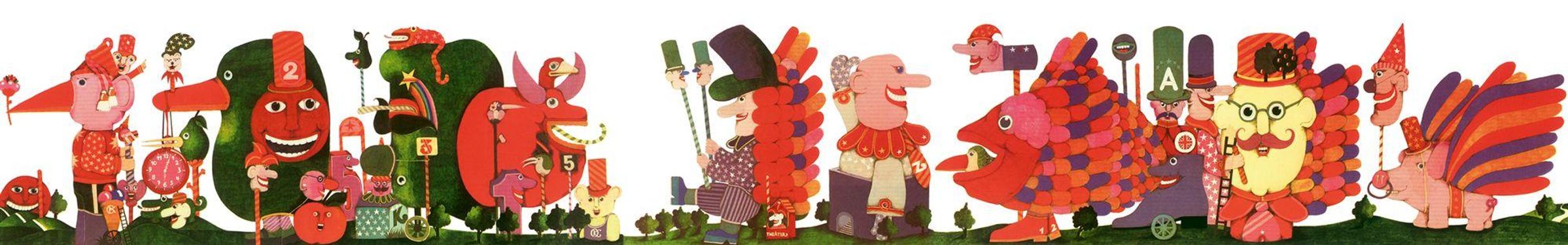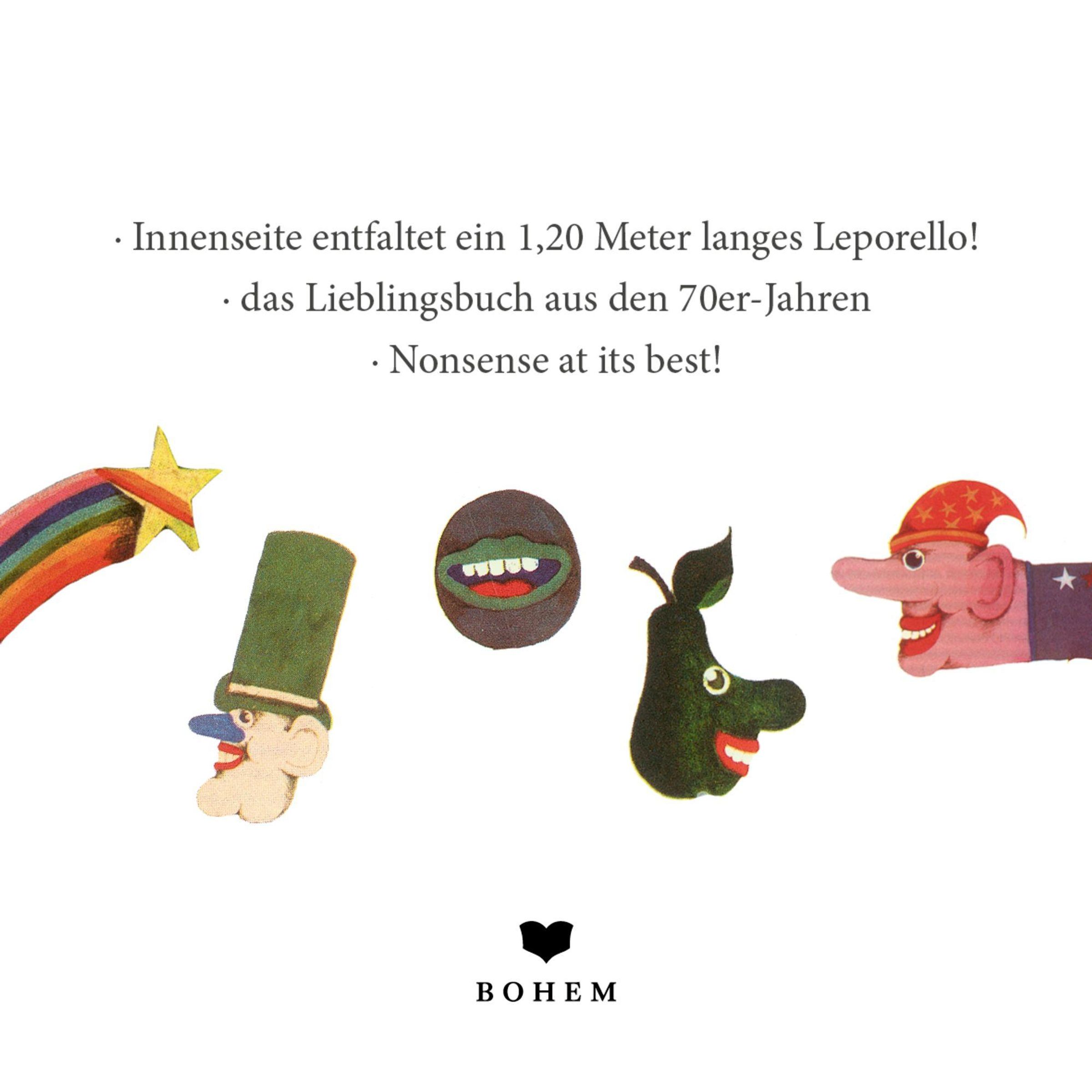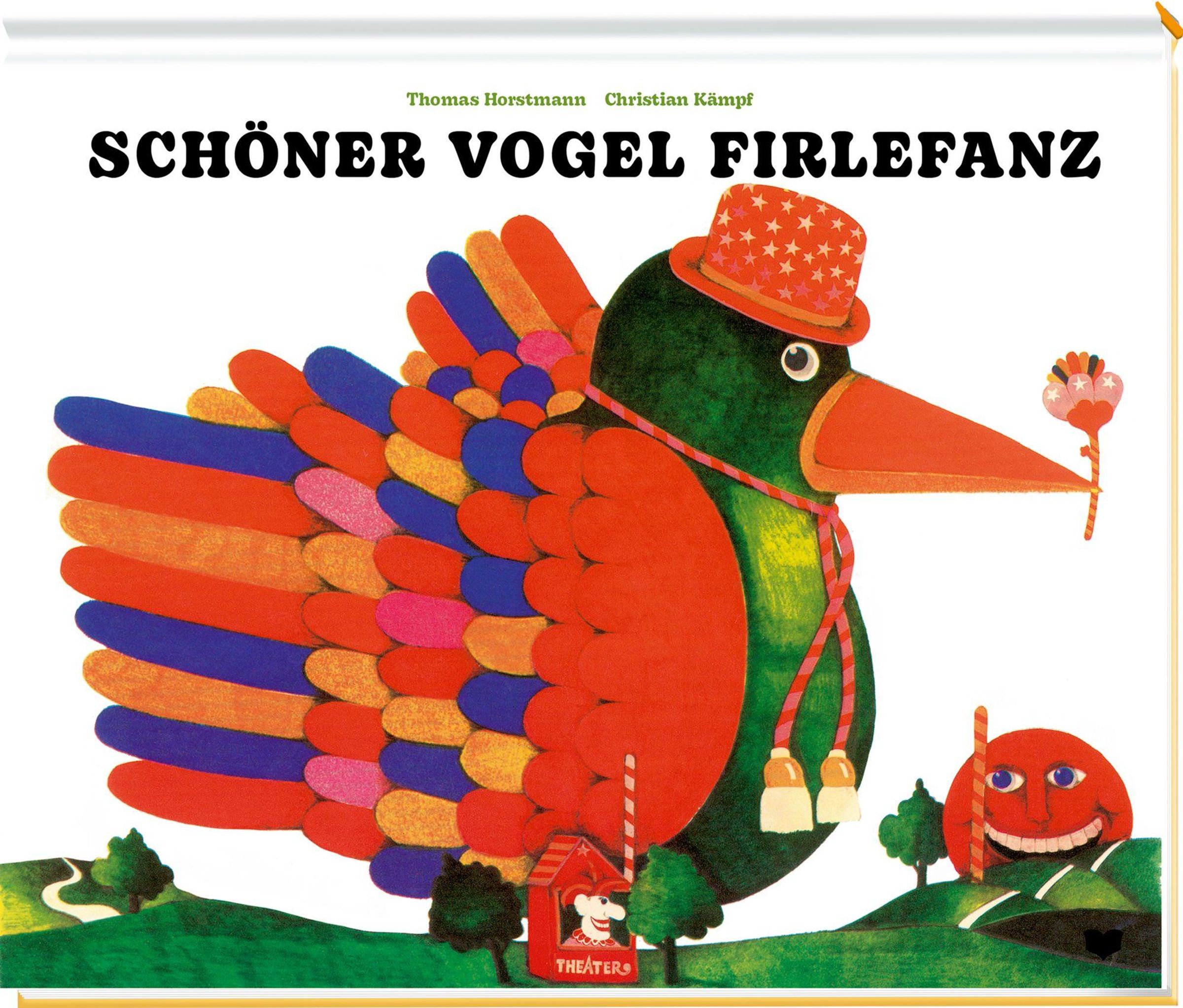 Titel: "SCHÖNER VOGEL FIRLEFANZ". Bunter, stilisierter Vogel mit Hut, trägt ein kleines Zepter, Laub und Hügel im Hintergrund., Buch