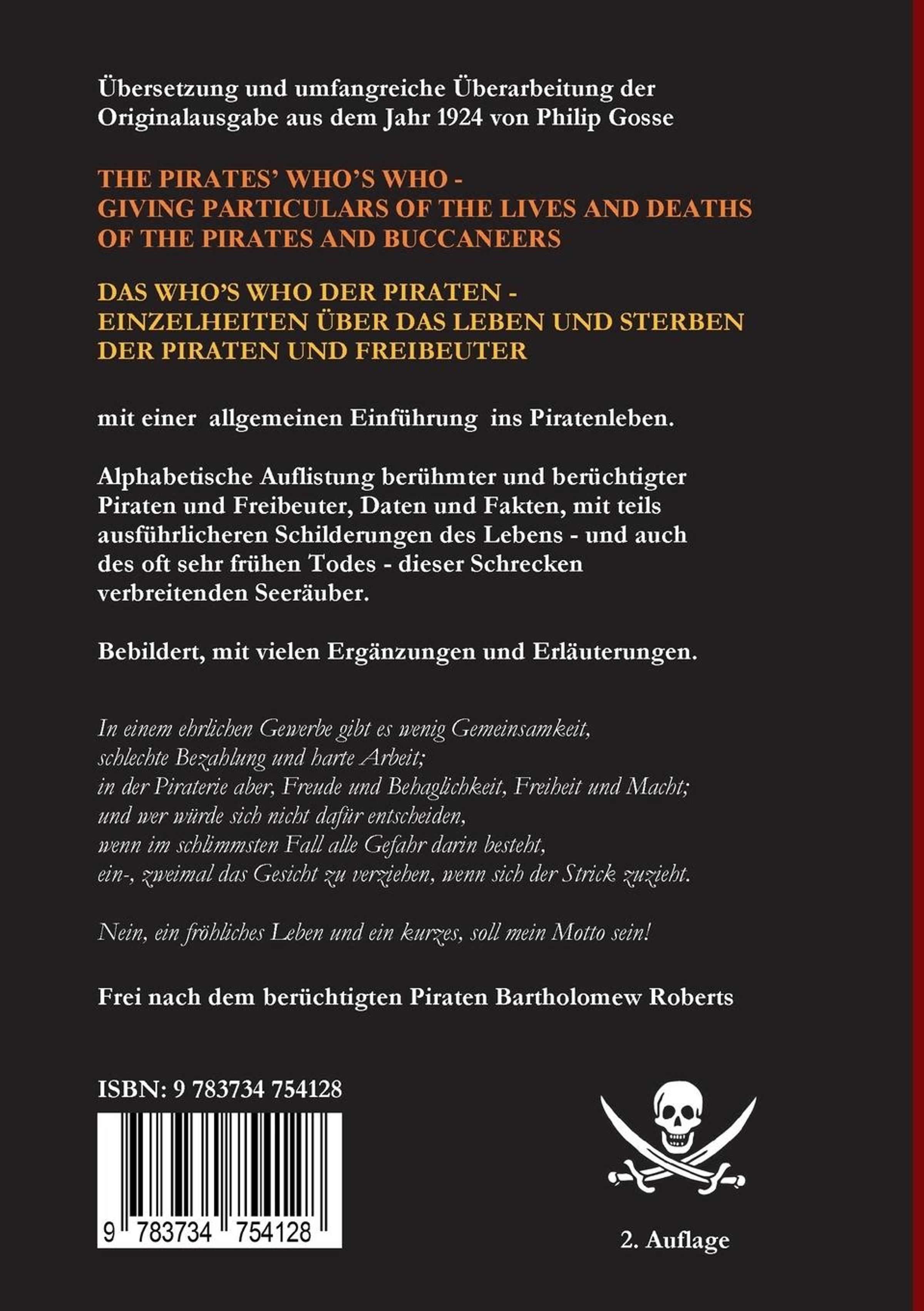 Übersetzung und umfangreiche Überarbeitung der Originalausgabe aus dem Jahr 1924 von Philip Gosse, THE PIRATES' WHO'S WHO - DAS WHO¿S WHO DER PIRATEN - EINZELHEITEN ÜBER DAS LEBEN UND STERBEN DER PIRATEN UND FREIBEUTER, mit einer allgemeinen Einführung ins Piratenleben. Alphabetische Auflistung berühmter und berüchtigter Piraten und Freibeuter, Daten und Fakten, mit teils ausführlicheren Schilderungen des Lebens - und auch des oft sehr frühen Todes - dieser Schrecken verbreitenden Seeräuber. Bebildert, mit vielen Ergänzungen und Erläuterungen.