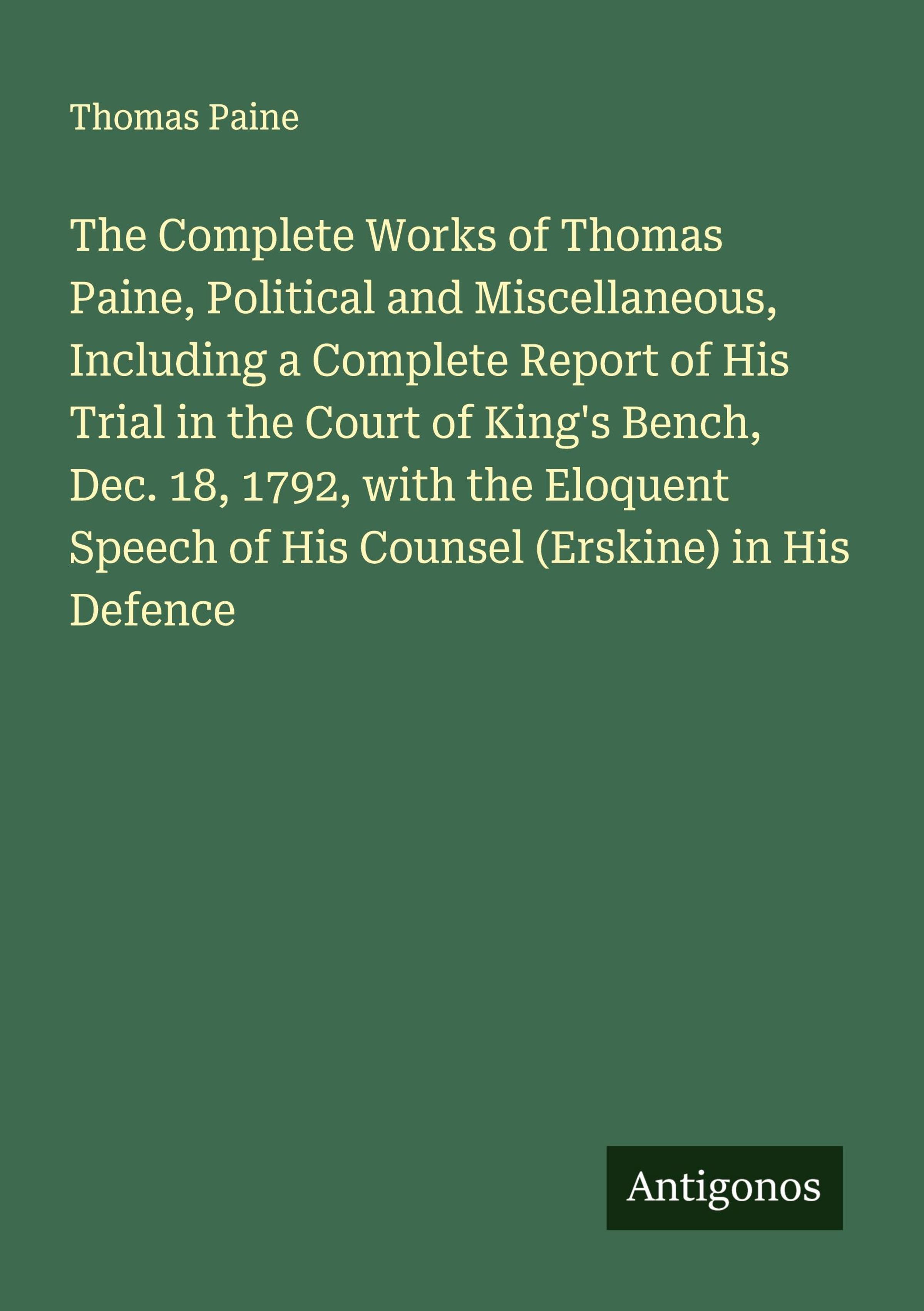 The Complete Works of Thomas Paine, Political and Miscellaneous, Including a Complete Report of His Trial in the Court of King's Bench, Dec. 18, 1792, with the Eloquent Speech of His Counsel (Erskine) in His Defence